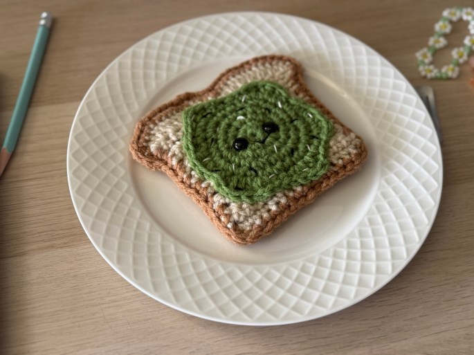 My daughter (age 13) crocheted this slice of avocado toast. She used a pattern from this book that we checked out at the library.