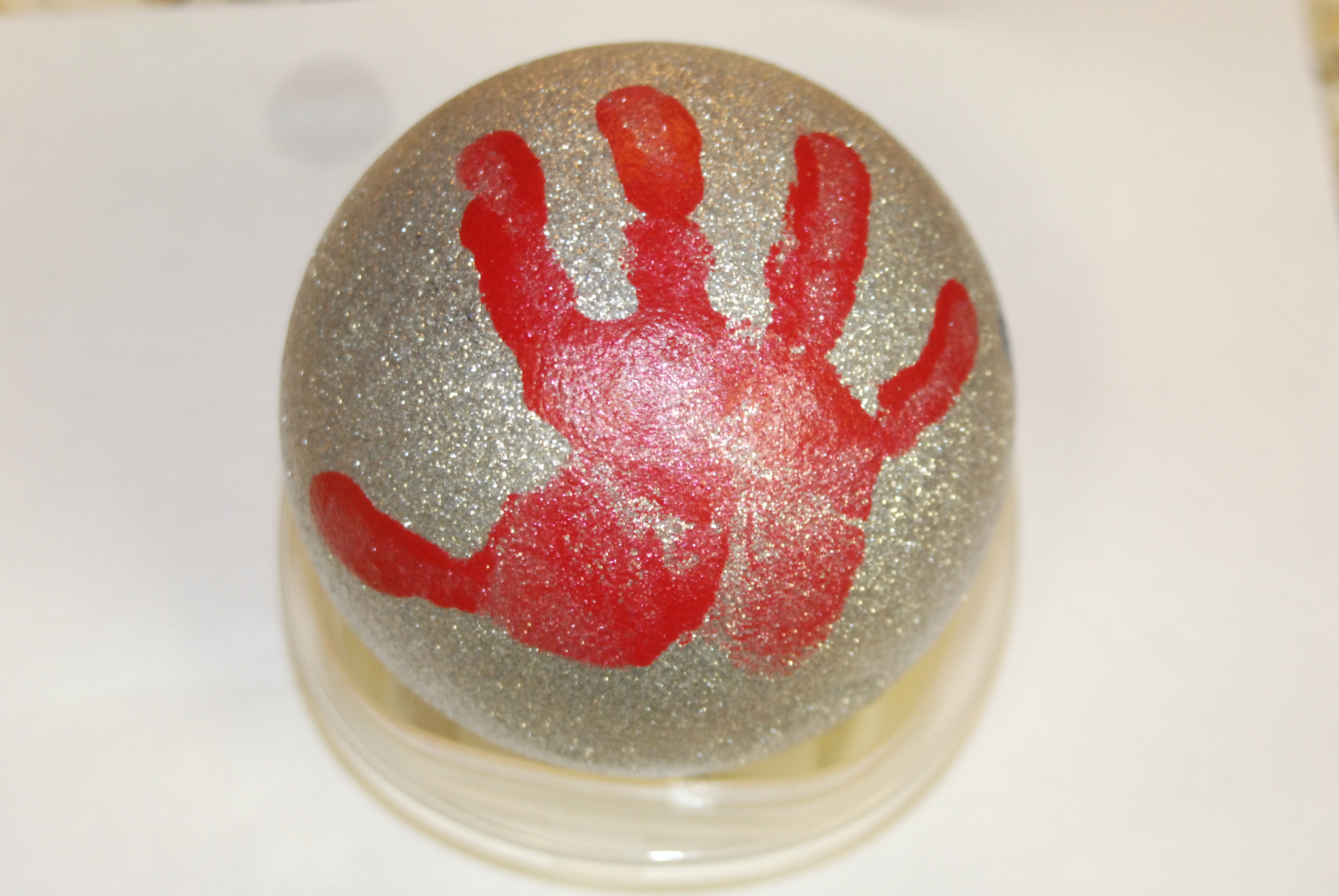 *Step 3 for Toddlers/Preschoolers +: Have the child “palm the ball” with outstretched fingers. Children’s paint-y hand prints seem to turn out best if you gently press down on each of their fingers (if they will hold still long enough). Toddlers don’t typically understand the idea of applying even pressure to each finger by themselves. Thus, we have done many hand prints with missing fingers (usually the pinky or the thumb).