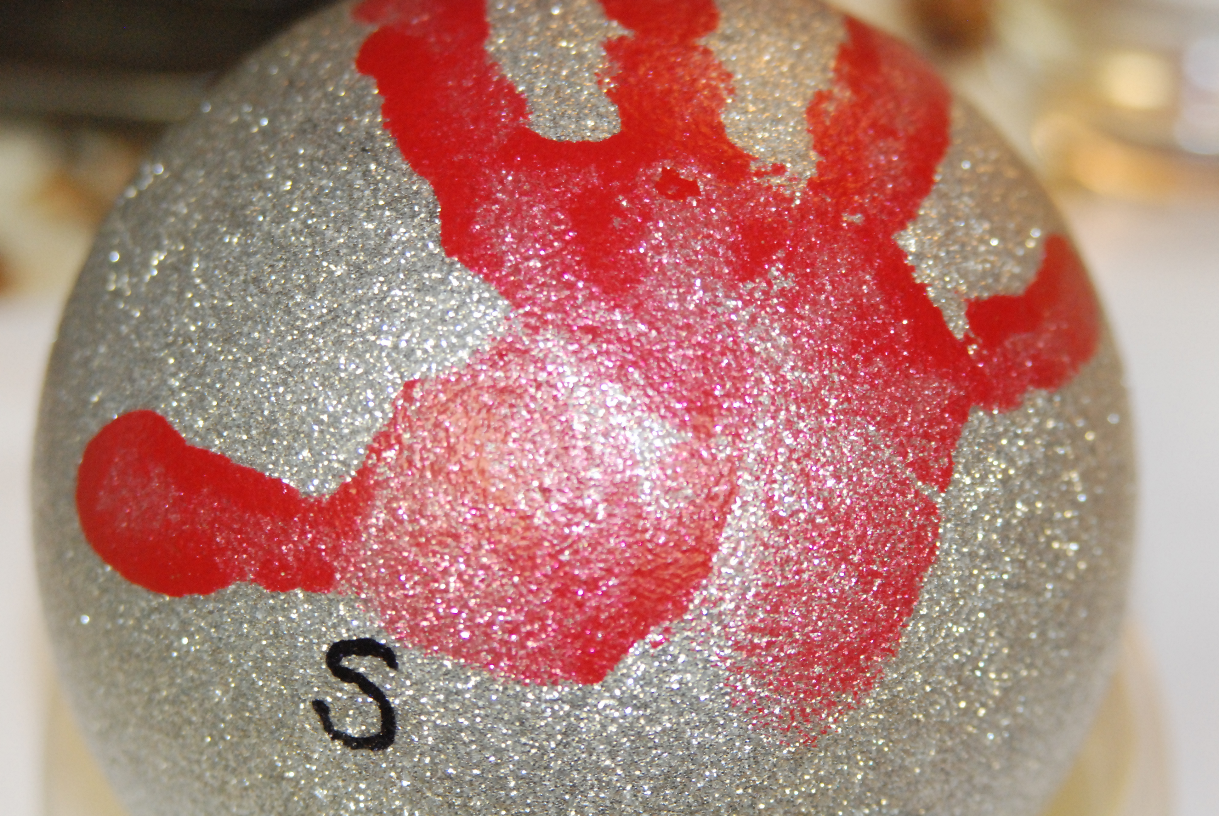 *Step 3 for infants and babies: Make sure the baby has napped and eaten recently. Convince another adult to assist you with a project of “great sentimental value”. Smile when you ask for their help and tell them how marvelous they are. You really cannot do this step alone, really. Trust me, I’ve tried to do it by myself other years. Have adult #1 hold the baby and hold one of the baby’s hands at the wrist. Meanwhile adult #2 should hold the paper plate with paint and the ornament. Now, working together as a well-oiled machine, get paint onto the baby’s hand and smoosh it onto the ornament. At this point adult #1 will also have paint on one or both of their own hands and adult #2 will wonder what they are supposed to do with the paper plate full of wet paint and the ornament now covered in wet paint, adult #2 may also have wet paint on one or both of their hands. To recap, that is one baby, two adults, a paper plate and an ornament all with wet paint on them. Try not to panic. Adult #2 (the one not holding the baby) should clean up first so they can assist adult #1 (still holding the baby). Once everyone is cleaned up, pat yourselves on the back and marvel at the priceless keepsake you’ve created (if you’re especially lucky it might even look a little bit like a hand print)!