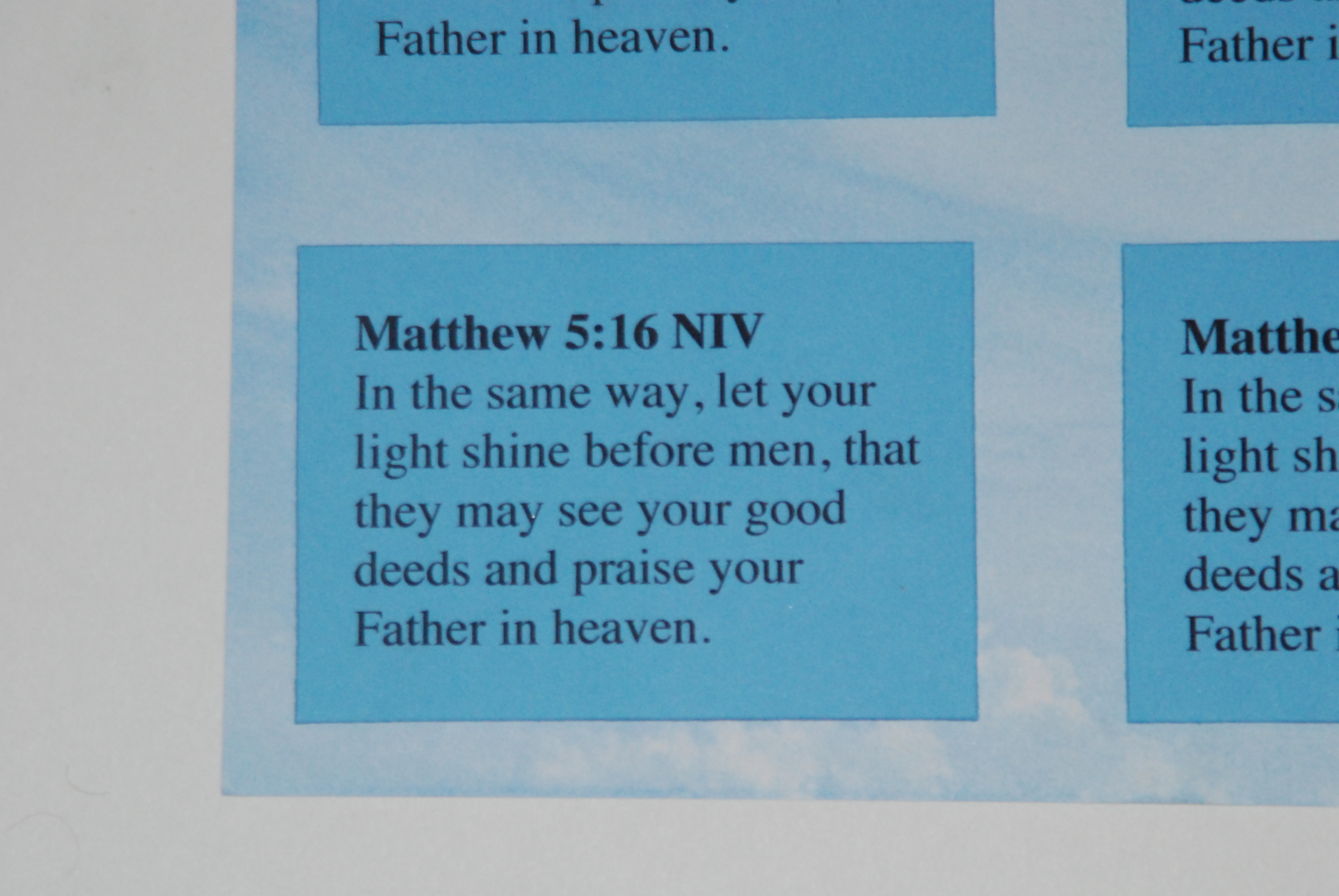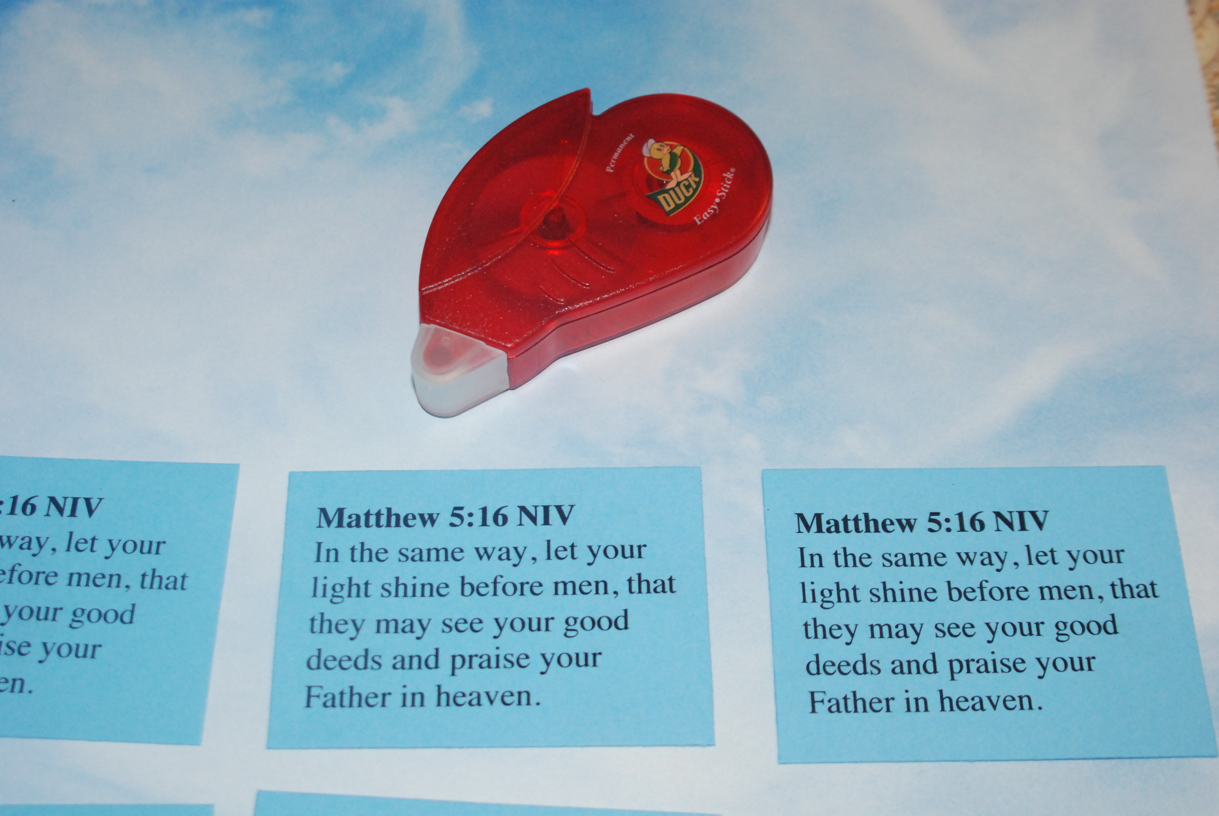 2. Print a Bible verse on colored card stock. I printed 8 verses on one 8.5 x 11 sheet of blue card stock.