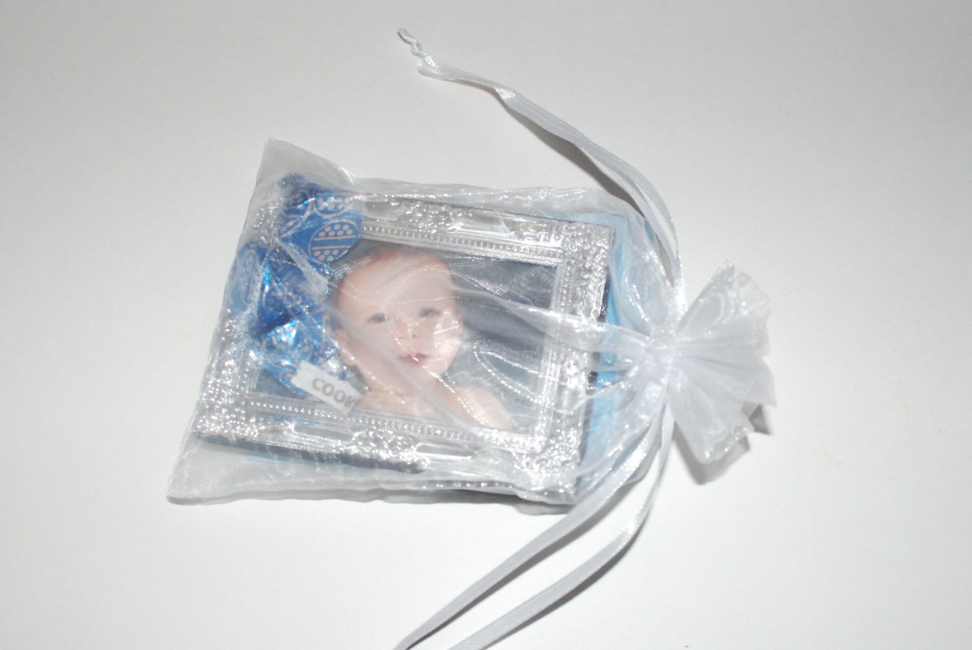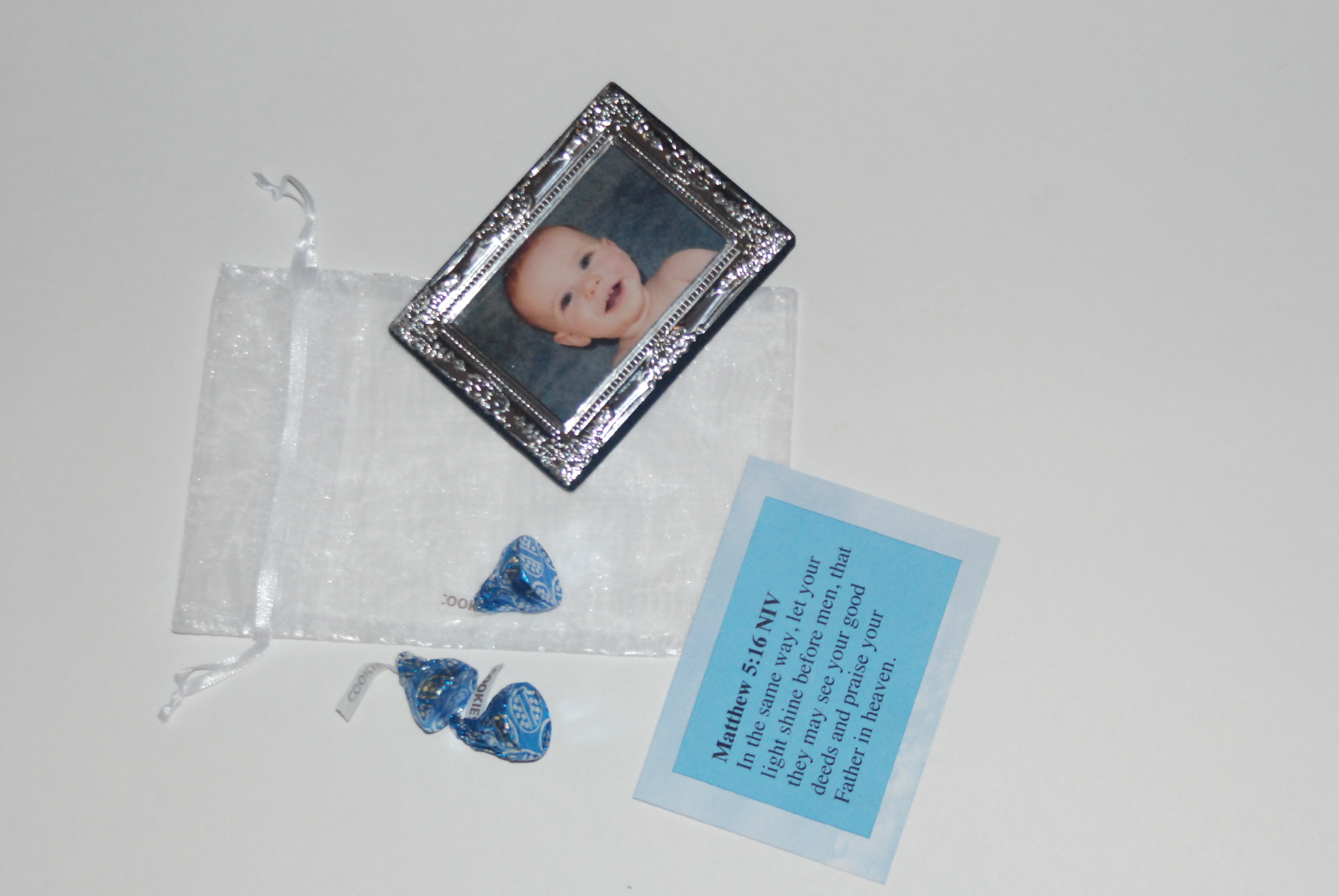 4. Put the Bible verse cards, framed photos and Hershey’s kisses into the organza bags.