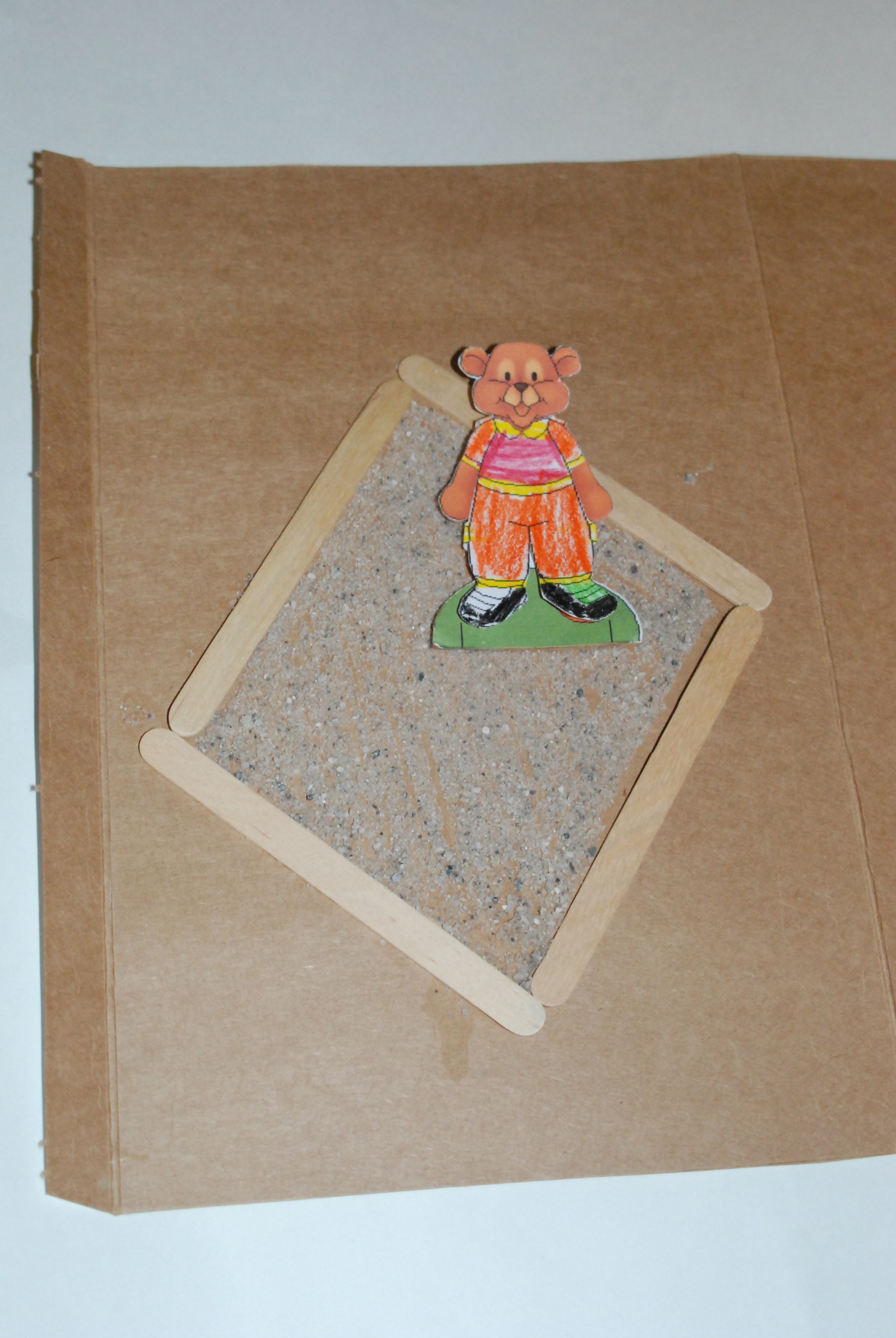 Step 3: Embellish what you built. We glued real sand into our sandbox. We used an old t-shirt to make a blanket for our bed and put glue just along the bottom edge so we could tuck our bears in for bedtime.