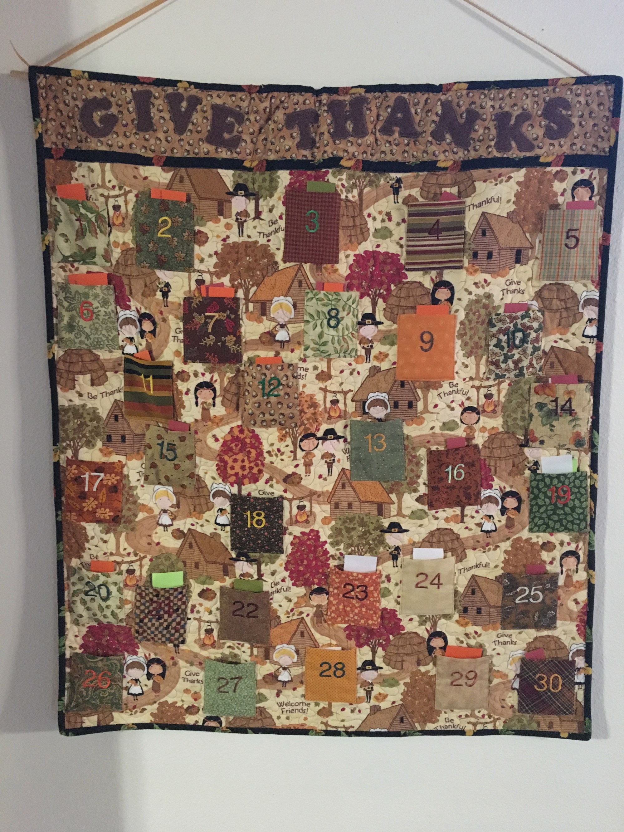 Thanksgiving is my favorite holiday. I’ve been wanting a countdown calendar since my oldest son was old enough to understand what a countdown calendar was. This year we had one made for us. Thanks Mom! It turned out super cute, my mom used her Bernina sewing machine to embroider the numbers onto each little pocket. I bought the background fabric on ebay.com because I just couldn’t resist it. My mom came up with the “Give Thanks” border along the top.