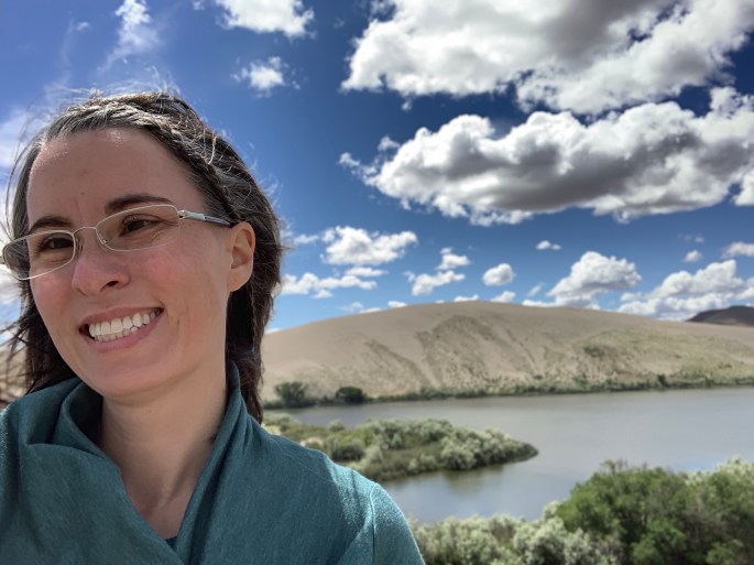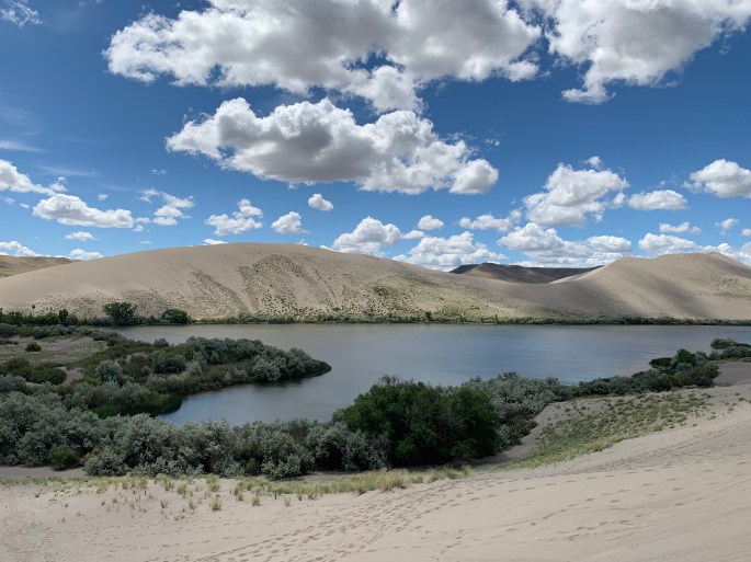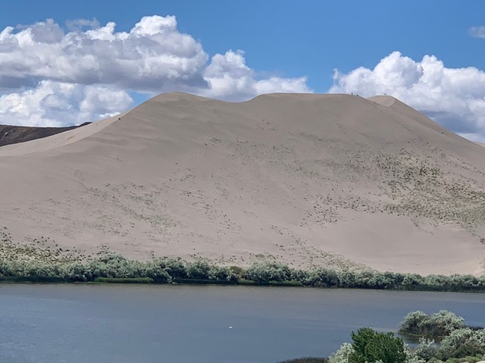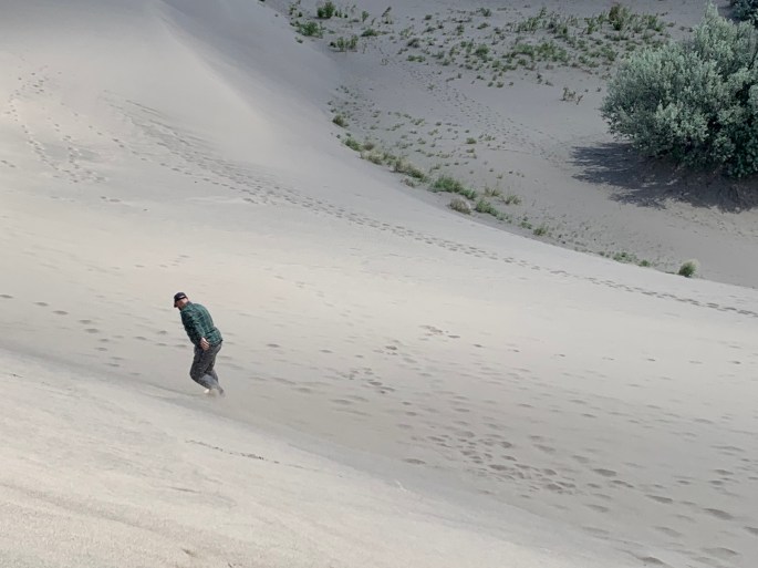 Sunny skies and cooler temps made perfect weather for a day trip to Bruneau Dunes State Park (pronounced “Bruno”). Located in southern Idaho, this state park boasts North America’s highest single-structured sand dune (about 470 feet high). This visit was E’s belated birthday activity and we rented a sand-board to try out a new sport.