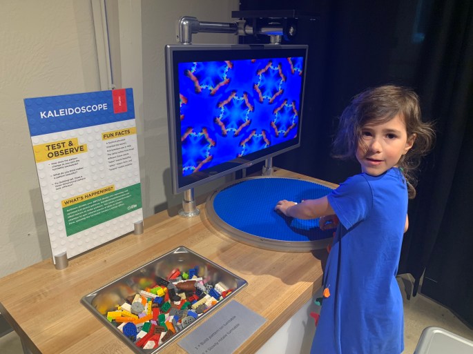 There were several experiment stations: music maker, stream table, parachute launcher, ball maze, kaleidoscope, shake table, racers, animation studio, and one using air to power gears that I didn’t get a photo of.