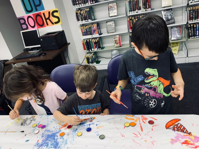 We somehow managed to make it to the local library in time for crafts at 3:00. The kiddos had a blast painting sun-catchers. Crafts are so extra-awesome when mama doesn’t have to prep and clean up. Especially on a day like today! Of course, we also signed up for the summer reading program and bought a stack of hardcover picture books at 25 cents a piece (cheap retail therapy for mama)! If you read, Summer Reading Program at the Library, you know how I feel about books!
