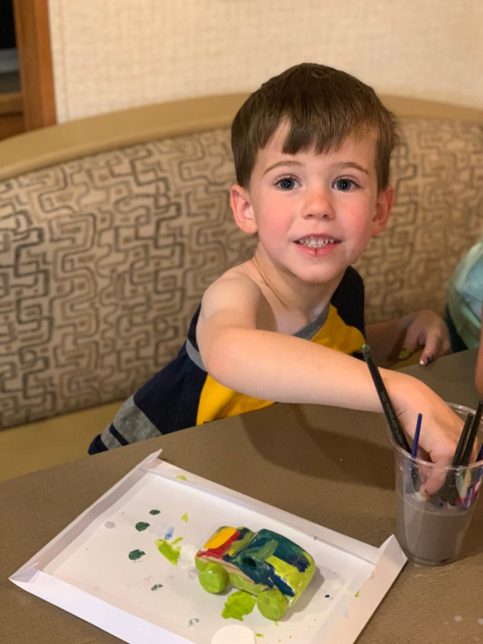 E isn’t a huge fan of kids painting projects. Living in the RV, I’m inclined to agree with him. Painting is messy. This is only the 2nd painting project that We’ve attempted in the last 6 months. I snapped photos at the start of the project, then I left the table for 5 minutes and came back to this boy. Boy, oh boy! “I got paint on my shirt but it’s okay ‘cuz it’s blue and it matches my shirt.” Why did you take your arm out of the sleeve? “I don’t know.” lol
