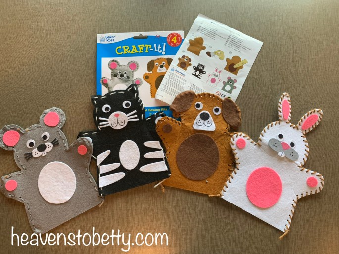Thursday: We made puppets from a fun kit I bought on amazon.com. This was a great learn-to-sew kit. The holes were pre-punched and the plastic “needles” had rounded tips. The kit included everything we needed to make 4 hand puppets.