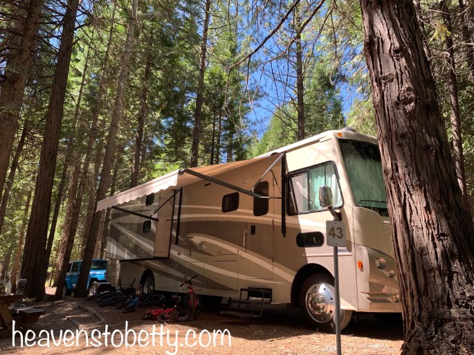 Allow me to veer a bit off course here for a moment. Truth be told, the gold panning road wasn’t nearly as bad as the wrong turn we made getting from Carson City, NV to Leoni Meadows, CA. If you’re driving a rig in the area we would strongly recommend not taking “Cedar Ravine Road“. I didn’t stop praying the entire time we were on it. Granted, I don’t know why anyone driving a 35 ft Winnebago would turn onto any road with the word “ravine” in it. We’re still new at this. At any rate, we were blessed with God’s protection and made it to the right road eventually. I’m sure some guardian angels must have lifted some of those low hanging electrical wires. I might’ve gotten a few more grey hairs in the process.