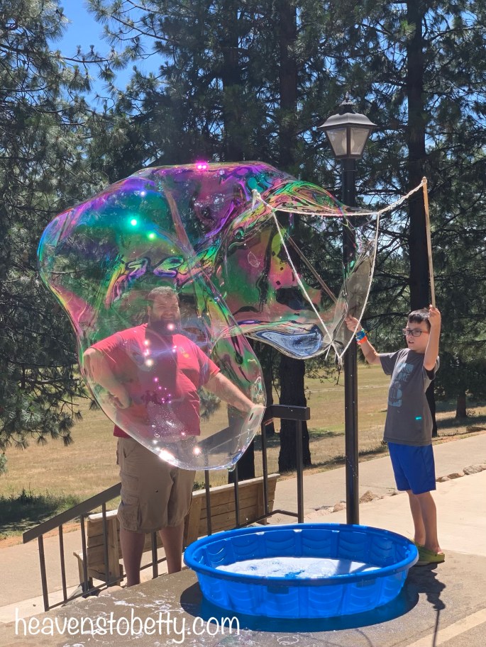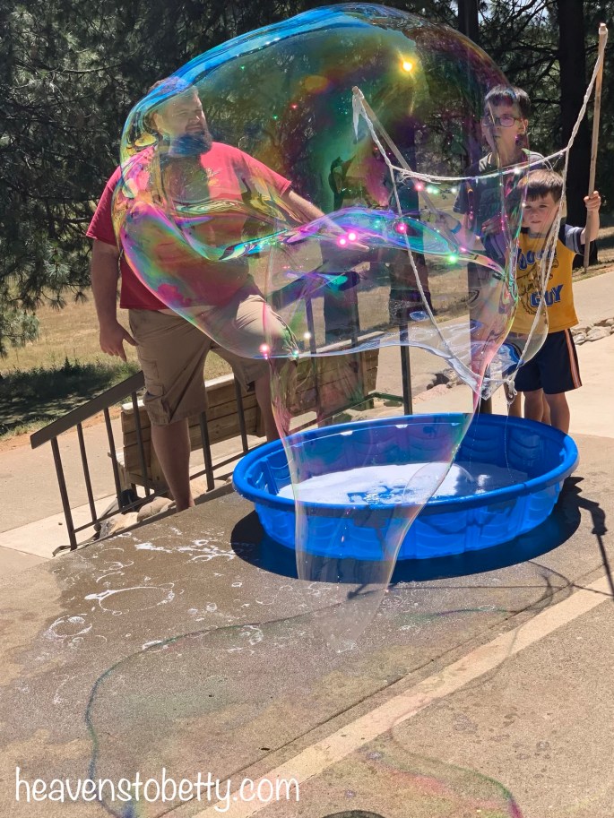 E, deserved an afternoon off to recover from the shock of submerging in that icy water. So while E tuned up his bike, the kiddos and I played with giant bubbles. Who doesn’t love giant bubbles?