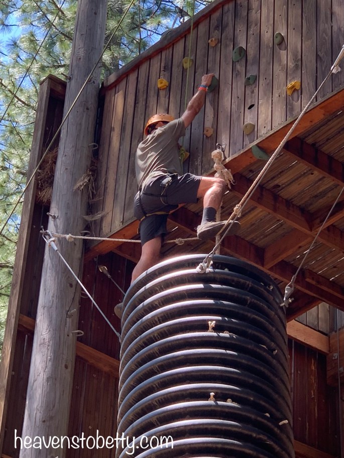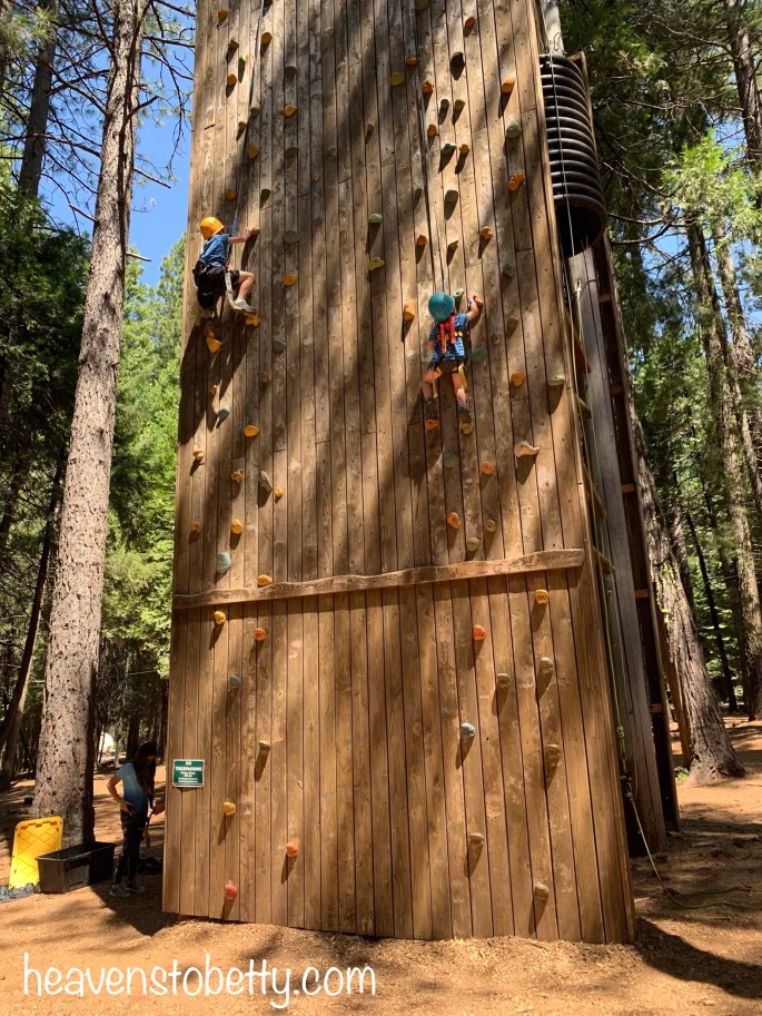 After a yummy hot breakfast at the cafeteria, morning worship under the ponderosa pines, another go-cart ride and more archery practice, we headed to the climbing wall. The kiddos had a great time climbing and E completed the “junk yard” obstacle course.
