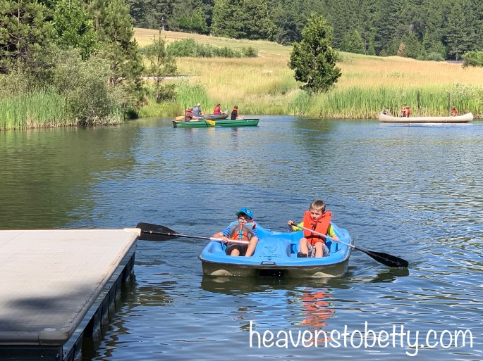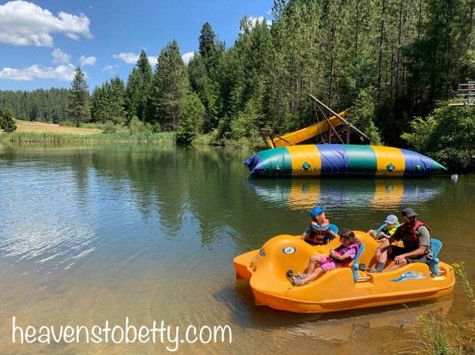 After lunch we headed to the pond for paddle boats and canoeing. Our canoe trip ended abruptly when K saw a spider in the canoe, and E and I were fairly certain she was going to capsize us trying to get away from it. If you read, New Frontier RV Park, you know where she got her genetic predisposition to insect/arachnid avoidance. Moving along… after family rides, the kiddos wanted to go with their friends “all by themselves”. I was impressed with how well they managed the paddle boats. Great job kiddos! In the background you’ll see “the blob”, used to launch campers into the air, and a yellow water slide. It really was too chilly for us to swim in the pond though! A big Kudos to all the brave kiddos, mamas, and grandma that we watched go for a trip down the slide!