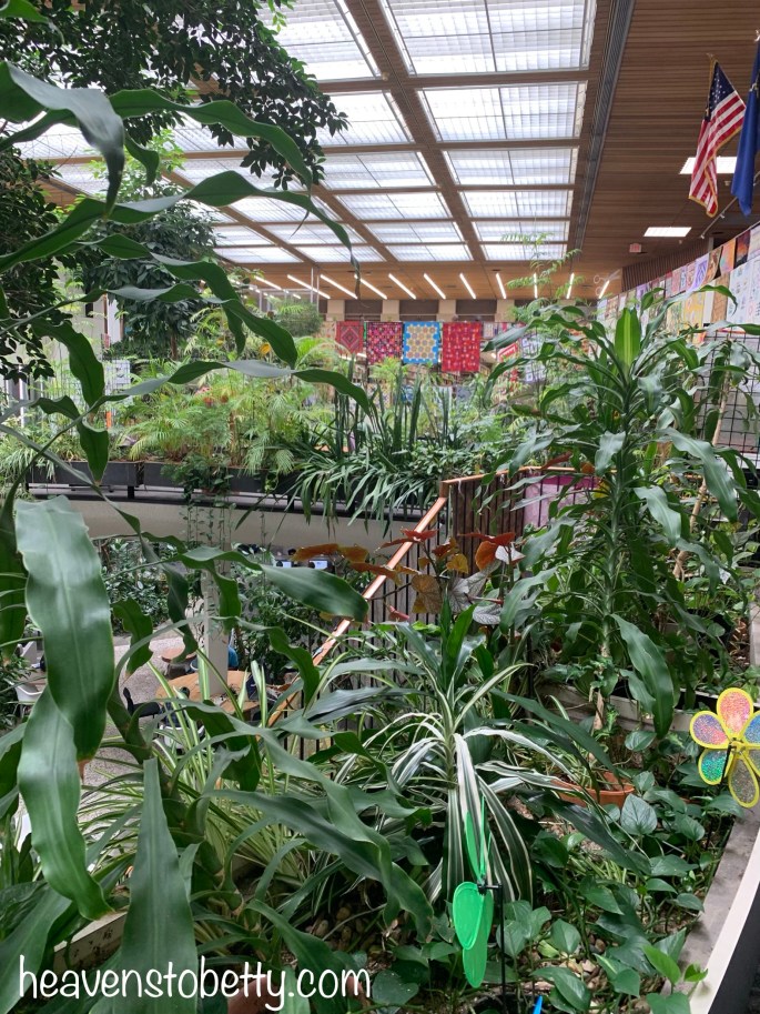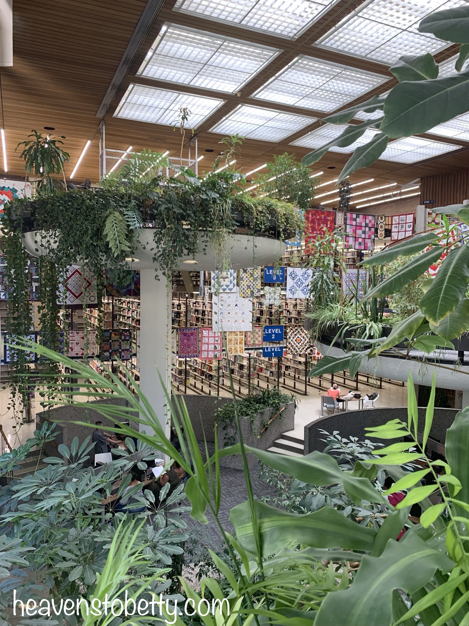 On Friday, we visited the downtown Reno library. Oh my! What an amazing library! It was, as S said, “like a rainforest”. Their rotating art display was from the Truckee quilt guild. What a gorgeous library. Check out these photos. This was my favorite part of Reno!