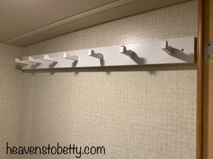 On Monday, the towel rack in the middle bathroom fell completely off the wall. The weakness was, that it had been attached to the wallpaper. The adhesive was still intact, and holding tightly to both the towel rack and to the chunks of wallpaper that had ripped off the wall. Oh dear! Luckily, E is a pretty handy guy. He fixed it with a piece of oak that the nice folks at Home Depot cut for us, and some screws.