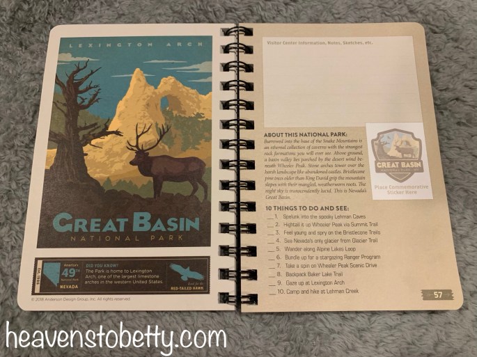 Each park has a two page spread with fun facts, activity suggestions, a place for notes (I put a photo in the “notes” section), and a spot to stick the commemorative sticker (included in the book).