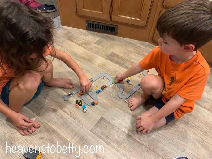 1. I found these “Driven” brand, miniature cars, planes, and tracks that come in a storage “garage” at Target. Each kiddo has about 4 sets. If they put them all together they can make a pretty decent track. They remind me of Micro Machines but they are not as good as those were.