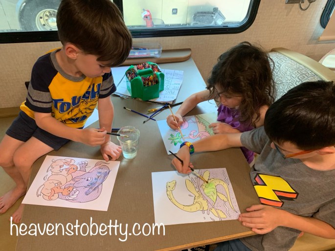 1. Paint with water books from the Dollar Tree. All the fun of painting but without the paint. Well, it’s not actually quite as fun as painting with real paint. It is fun though, and a much less messy than real paint. Plus, it can easily be turned into a writing project by having the kids make up a story about the picture and write it in the back after it dries.