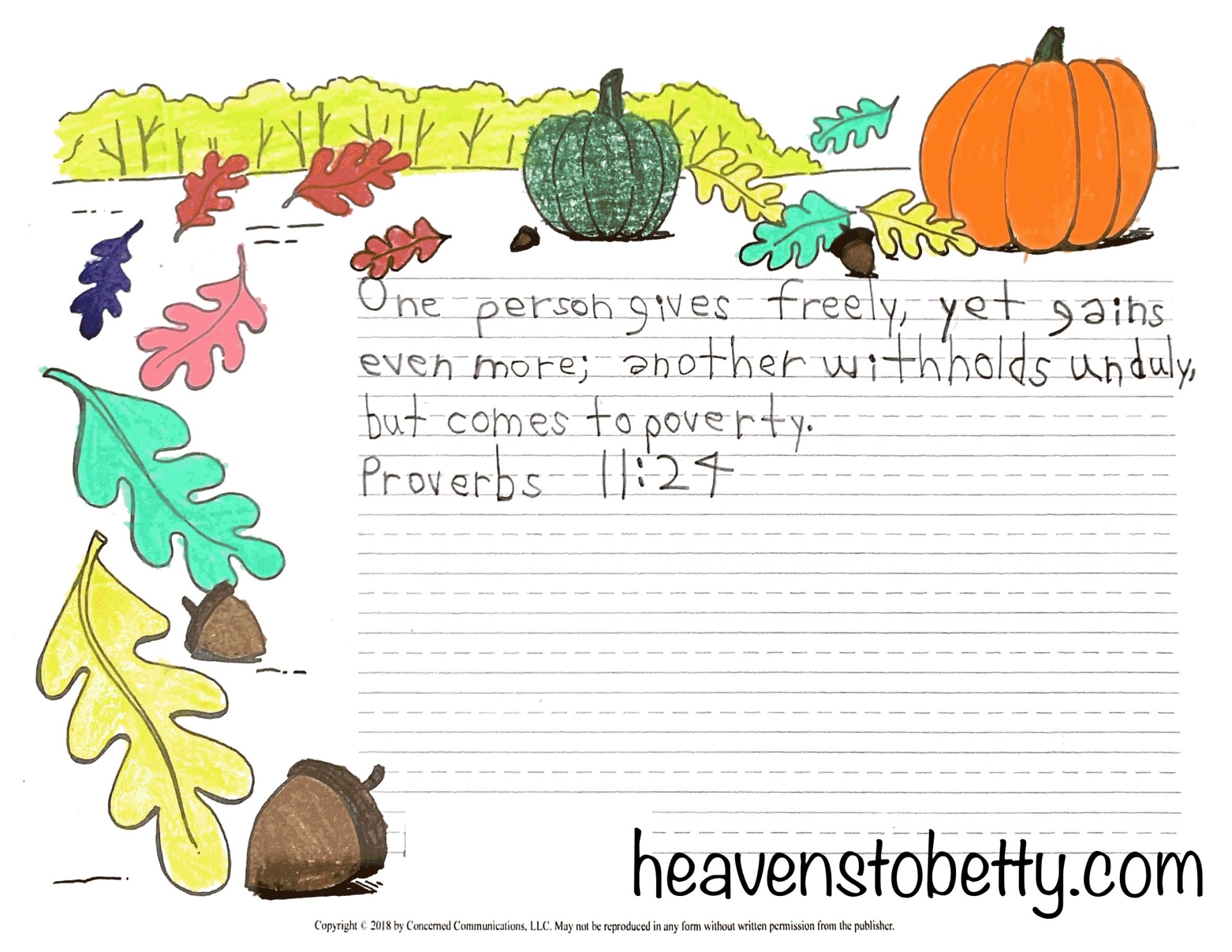 Here is the Bible verse we are working on this week. If you’d like, you can memorize it with us! I thought that this verse tied in nicely with our book of the week, Too Many Pumpkins, in which Rebecca Estelle is very generous in giving away pumpkin treats.