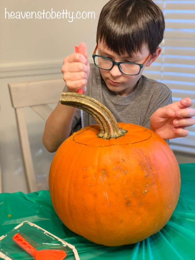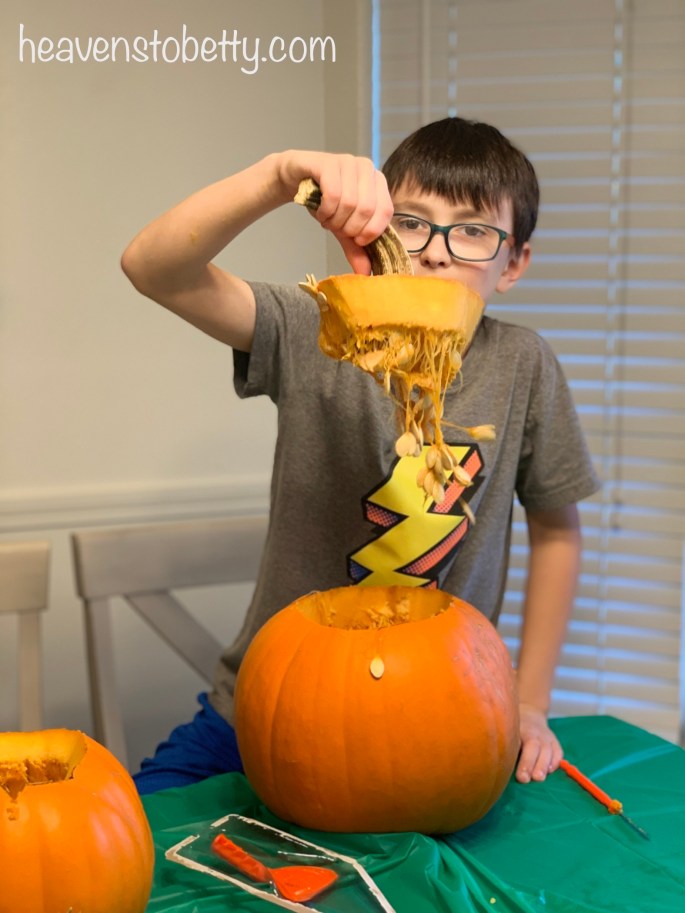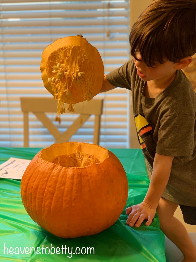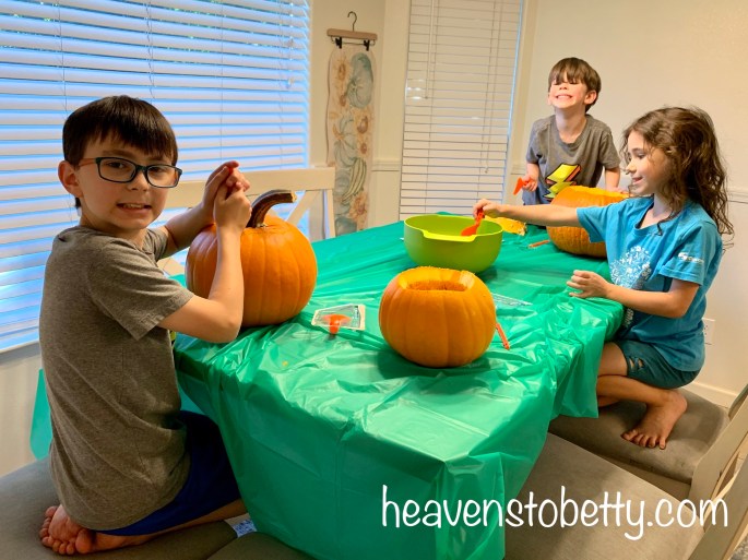I decided to take on pumpkin carving with the kiddos this year. As you know, it’s a big messy project. Big messy projects = lots of fun for kiddos! We have painted our pumpkins in the past, because it’s easier and the pumpkins last longer. The kiddos were super excited about carving them this year and we even bought pumpkin carving tools at the grocery store. We used a plastic tablecloth from the Dollar Tree as a disposable drop cloth.