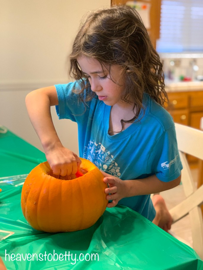 We let Ari carve her pumpkin this year too! She completely empathizes with K. She was not a fan of cleaning out her pumpkin.