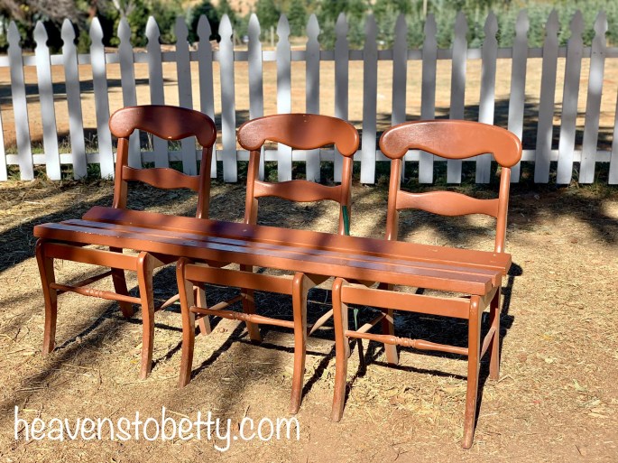 I admired this clever bench made out of 3 old chairs and 2×4’s.