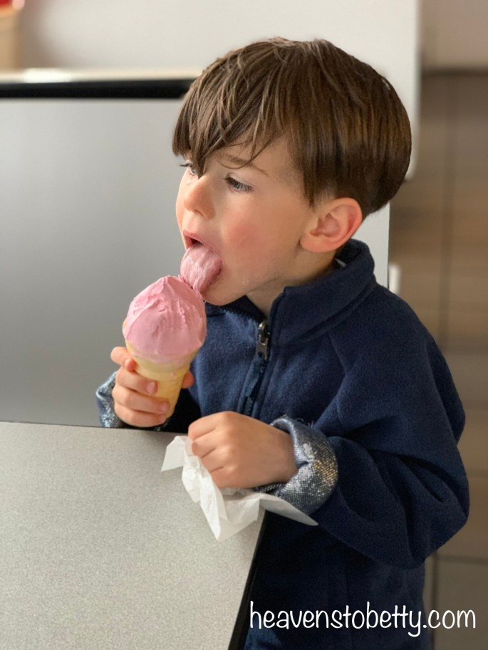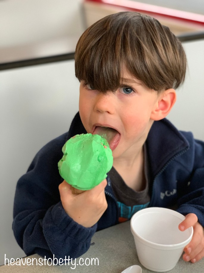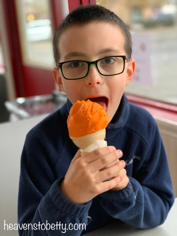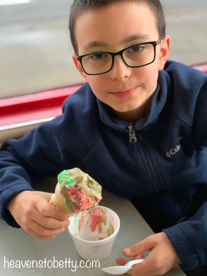 We went to Brock’s again for an “after-successful-check-up” treat. The pediatrician gave us a local insider tip: if you order rainbow sherbet they scoop together bits of lime, orange, and raspberry sherbet and smoosh them all together. Obviously, we had to try it! S has a dairy sensitivity so he’s a big sherbet fan.