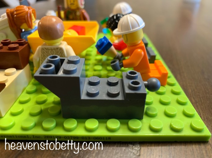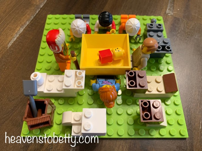 Here are Mary, Joseph, baby Jesus in a manger. My 5-year-old son added his Lego dump truck bin to make a manger that baby Jesus wouldn’t roll off. There is also a shepherd with a staff, 3 wise men with gifts, a donkey, a cow and calf, and 2 sheep in the scene.
