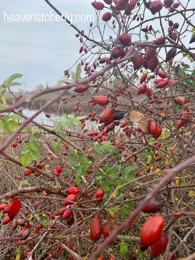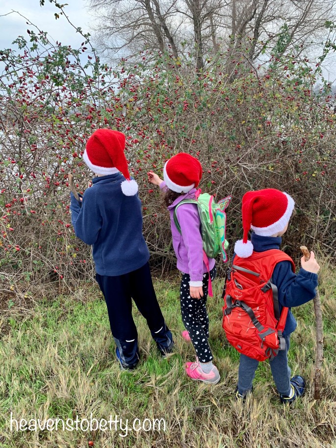 It was a pretty gray day, which was fitting because it is Gray Lodge after all. All the gray made for a nice contrast with the cool red barn on the drive there, the kiddos Santa hats (knit by my mom) and the wild rose hips we found along the path.