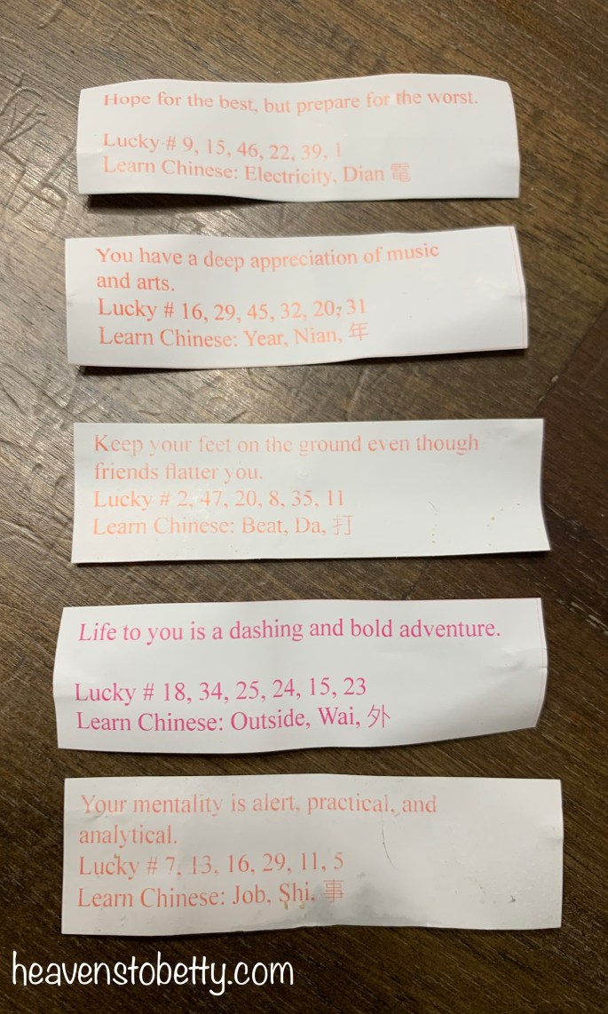 After thinking about, writing down and sharing my goals for the new year I took an idea from my friends LS and DS from Dave and Laura’s Dream and got us some New Years’ fortune cookies. We ordered Chinese take out for dinner and got 5 fortune cookies to go! Here are our New Years fortunes: