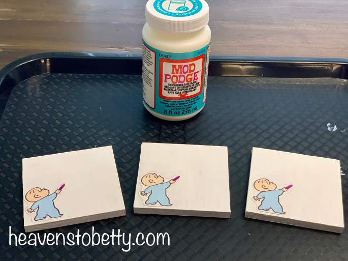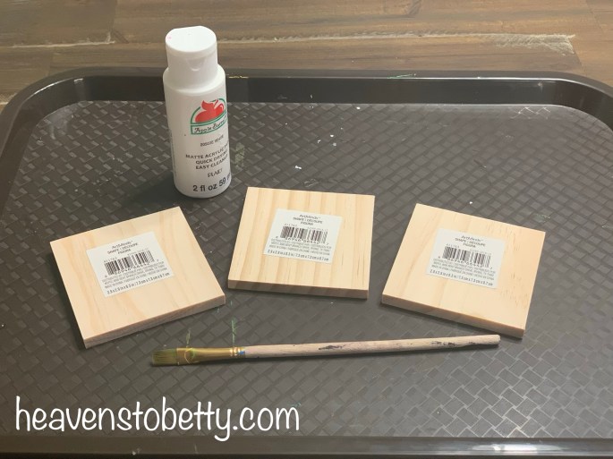 I bought 3 x 3 wooden squares from Michael’s and painted them white. I used acrylic paint and a brush but I would recommend spray paint if I was making more than 3 or so.