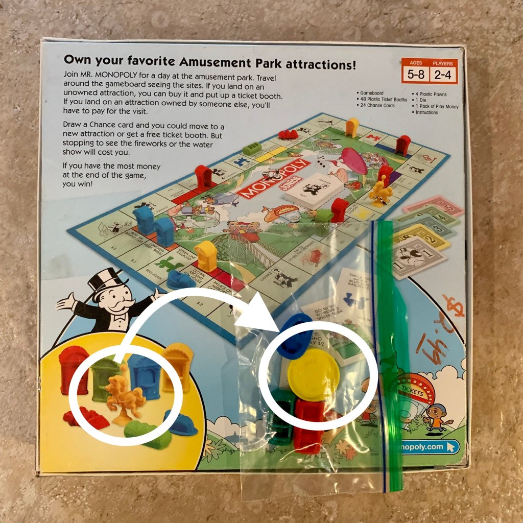 I like to check out the games before I put them away. I don’t want to pull out a game a week from now only to discover that we can’t play it. They are usually taped shut when I buy them so never know exactly what will be inside. It’s a risk, and it’s why I like shopping the 50% off sales. Most games have a list of the contents that are supposed to be inside somewhere on the game box. It’s easy to count the pieces in most games. Sometimes, games are missing pieces. Usually, thrift stores will not accept returns so if you find that a game is missing pieces you can’t return it to the store. You do have a few other options: