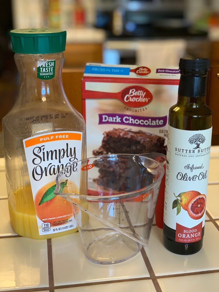 All you have to do is substitute the 1/4 cup of water with orange juice and the 1/2 cup of vegetable oil with blood orange olive oil.