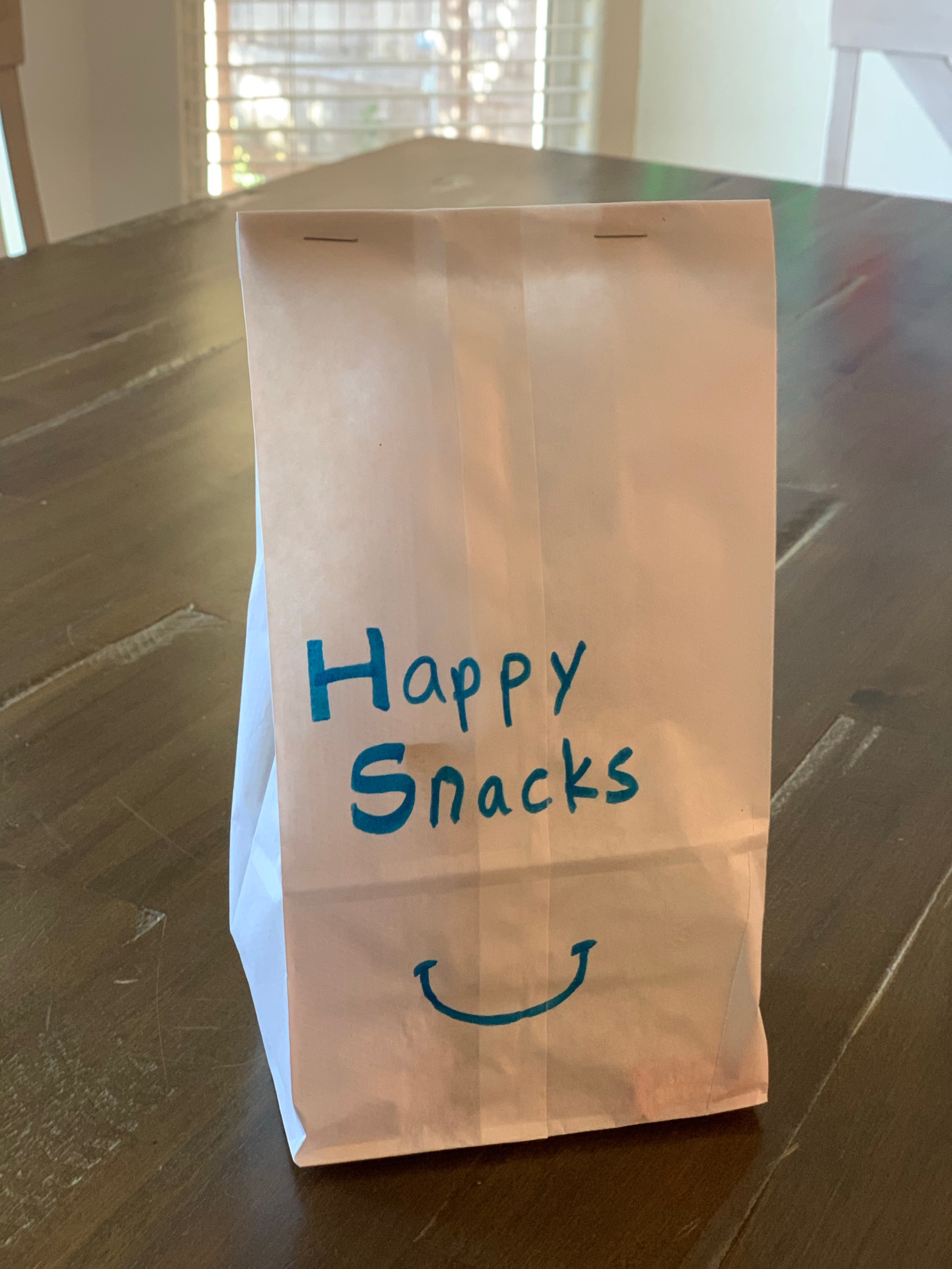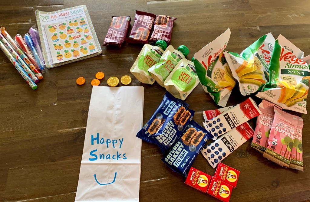 I made 2 āHappy Snackā bags for each of their 3 kiddos for a total of 6 bags. I used white paper lunch bags and filled each bag with treats, a writing instrument, scented stickers, and a road trip bingo page. I hope the pre-packed bags come in handy while they are on the road.