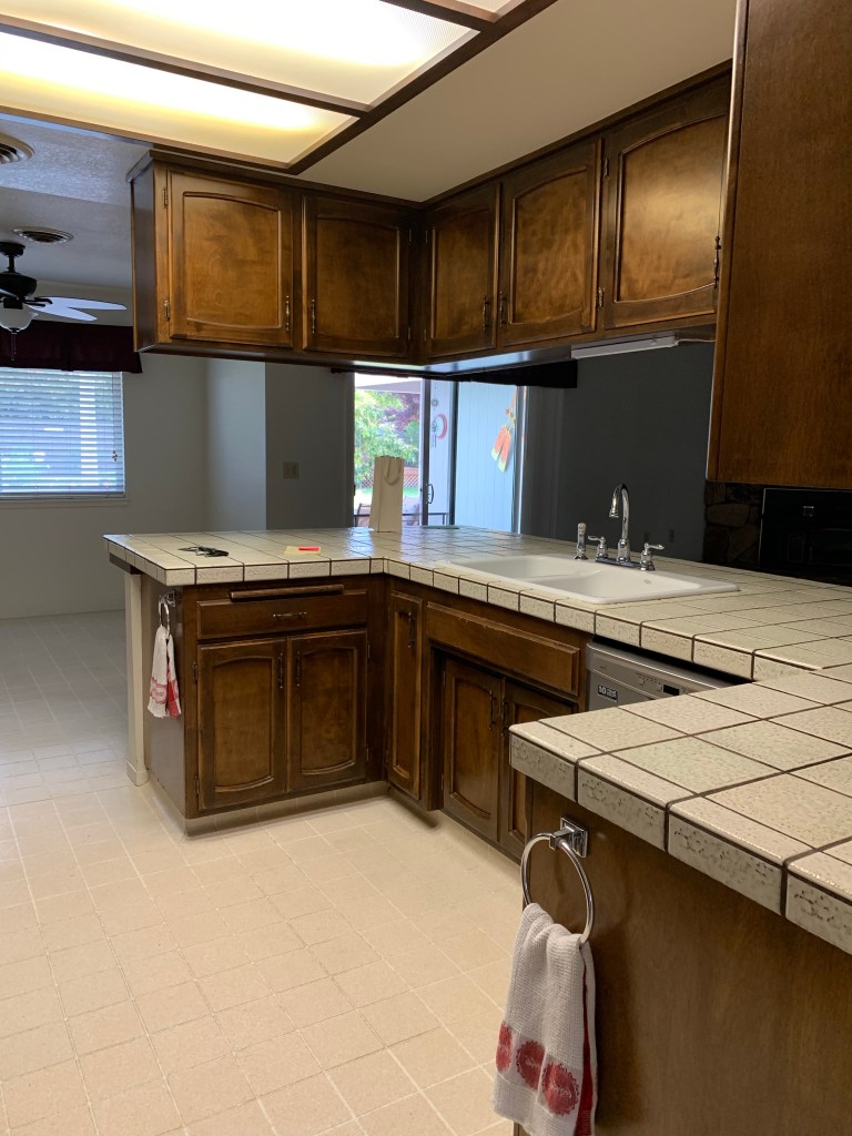 Our first project is removing a few kitchen cabinets to open up the space between the kitchen, family room and dinette. I just looked up the word “dinette” and it refers to a small space near the kitchen for informal dining. You see that? I learned something already!