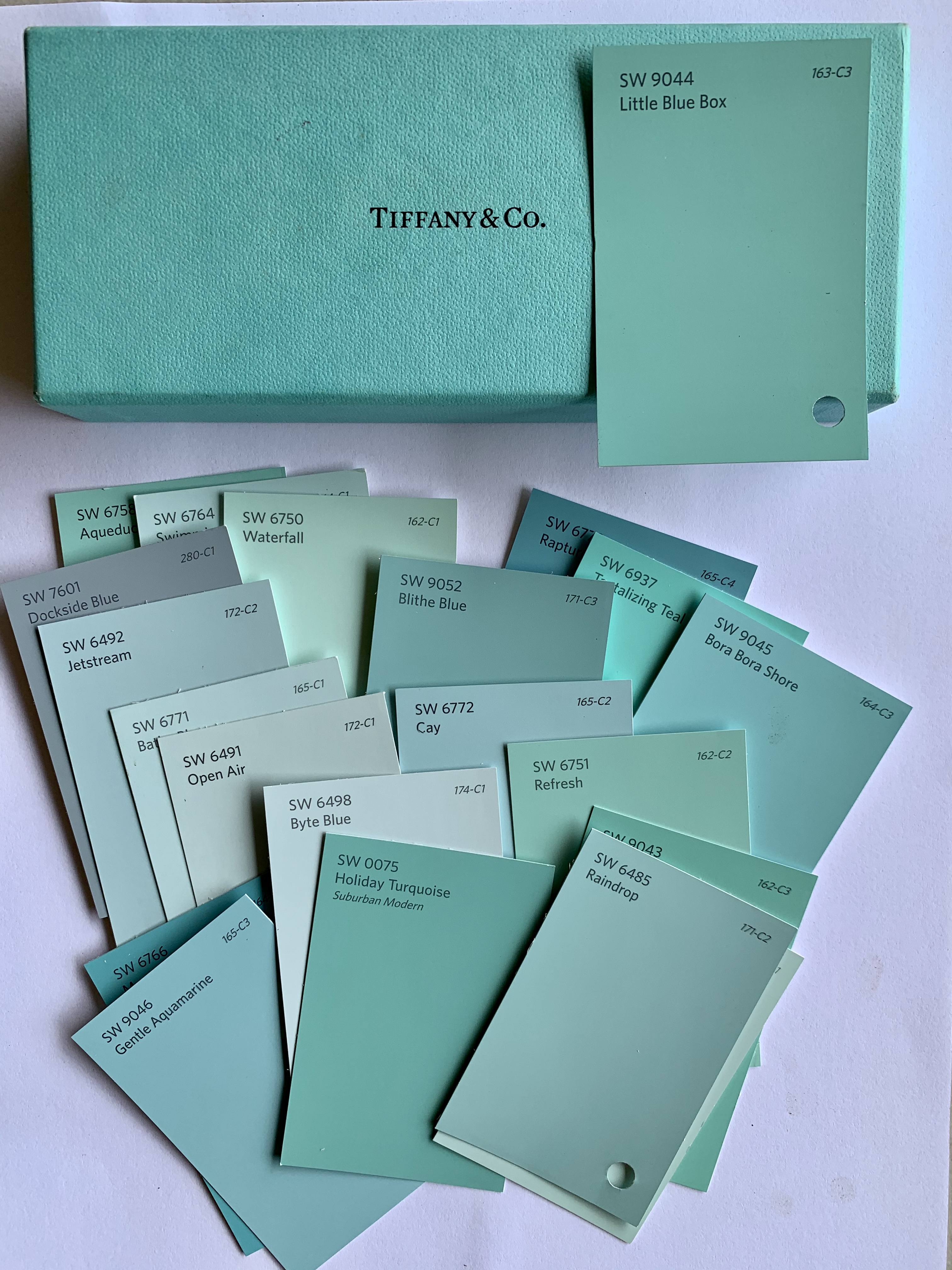 K’s room is going to have a mermaid theme. We were comparing several shades and tones of teal when it suddenly occurred to me that we just had to use Tiffany & Co box blue. Believe it or not, Sherwin Williams makes a color called “Little Blue Box” that is strikingly similar to my box lid. I guess I’m not the first woman to come up with this color idea! lol