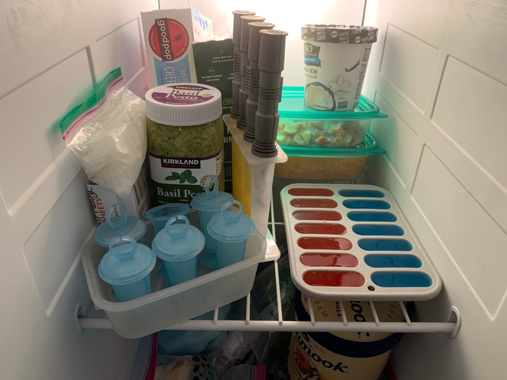 Success! Now you also get a little peek inside the freezer. Looks like we’ve got homemade frozen pops in several flavors, a bag of chopped onion, pesto, store bought popsicles, soy ice cream, frozen zucchini slices, and a mystery soup of some kind.