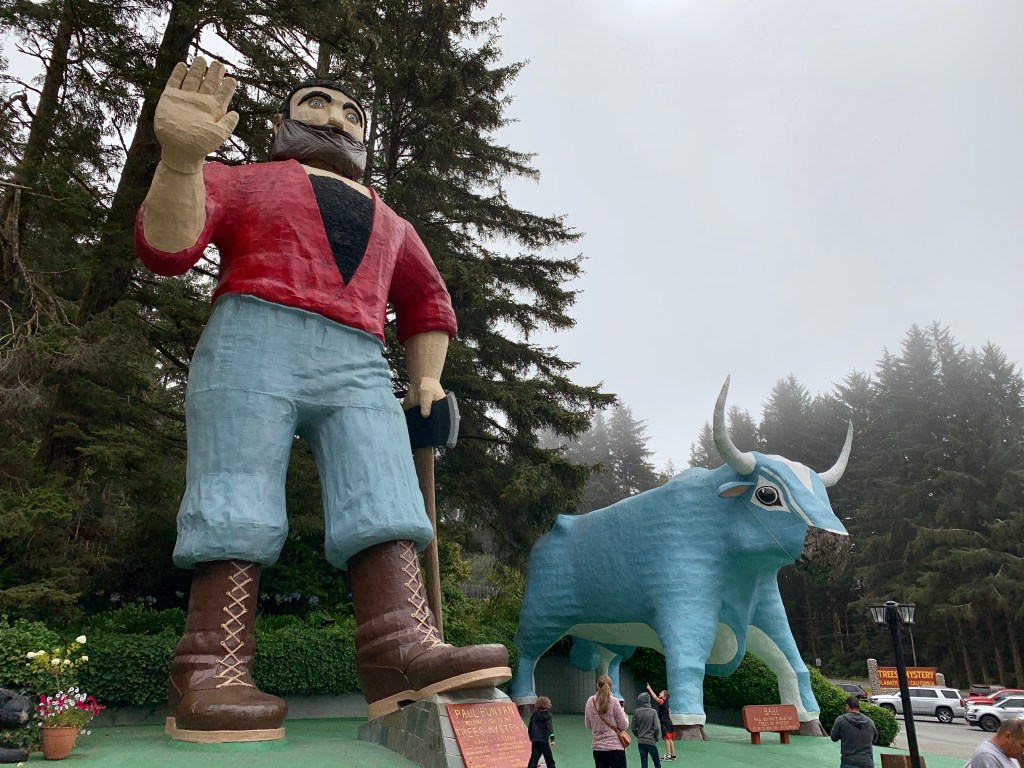 Trees of Mystery is home to majestic and gigantic redwood trees as well as towering statues of Paul Bunyan and his blue ox, Babe. Due to Covid-19, both of them were wearing masks.