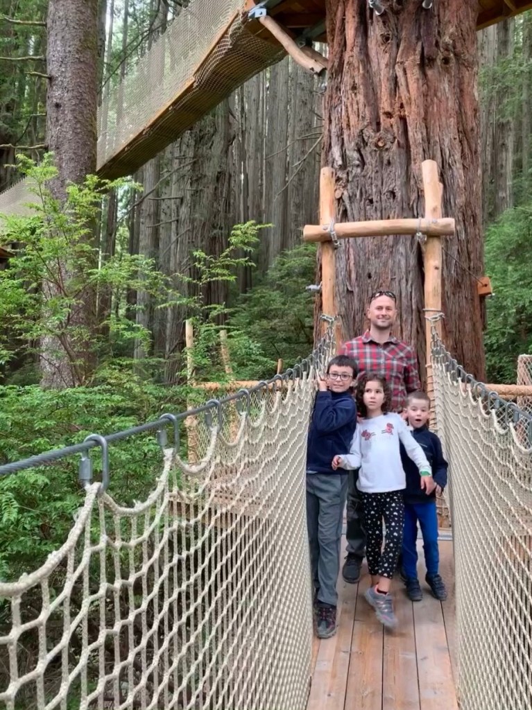 Once you have crossed the suspension bridges, and walked along the marked trail through the redwood trees, you can ride a gondola to a scenic overlook. We went during foggy weather, but on a clear day you can see the ocean from the top!