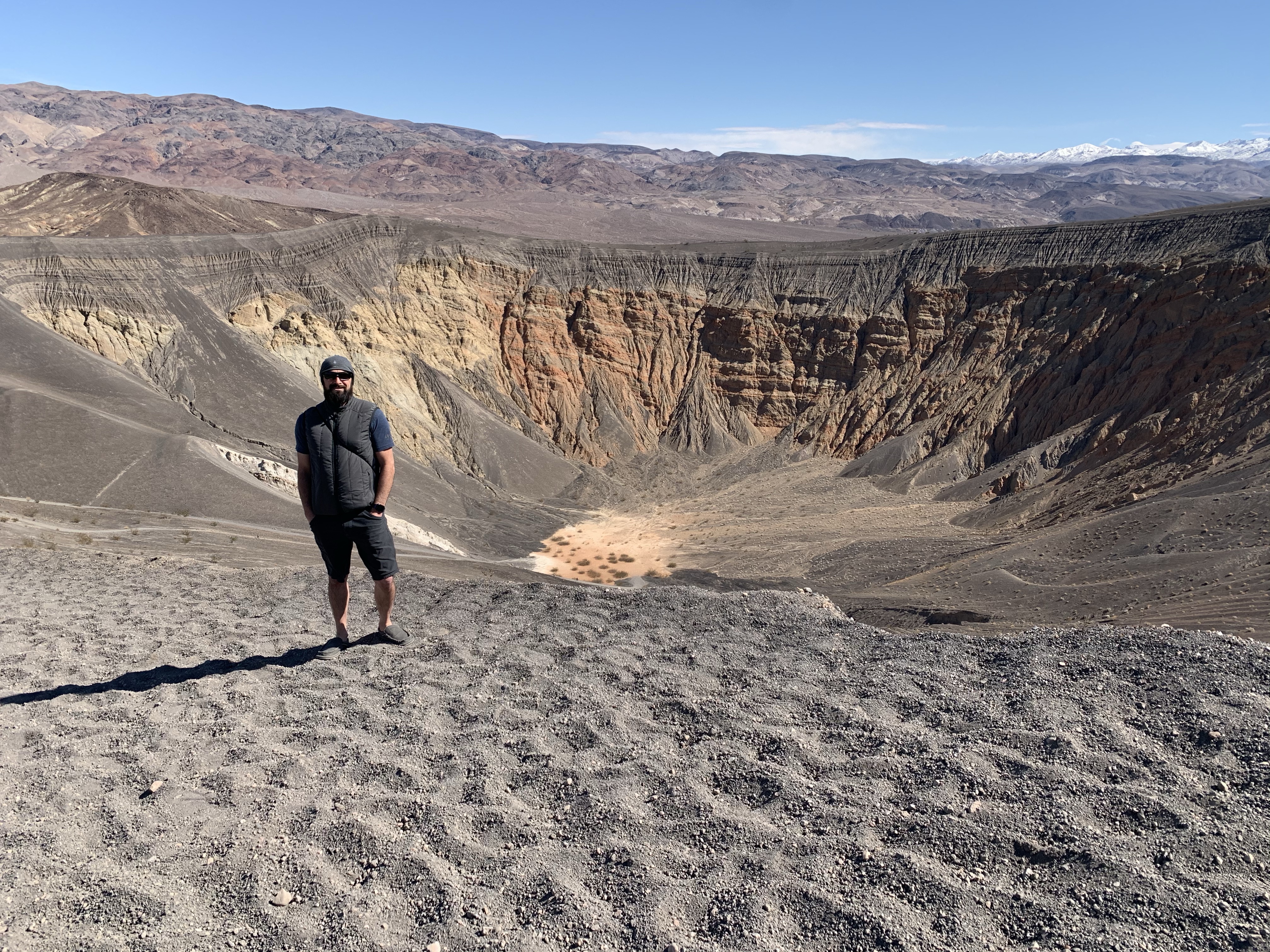 The drive to Ubehebe Crater was about an hour and a half from our campsite at Sunset Campground in Furnace Creek. When reviewing the National Park maps our intention was to hike the 1.5 mile loop around the mouth of the crater. When we arrived, we discovered that the pathways were really really loose gravel, the crater was really really deep and it was really really windy so we decided to just take a look, hike a very short distance to the smaller Little Hebe crater, take some photos of Ubehebe , and head to the next stop.