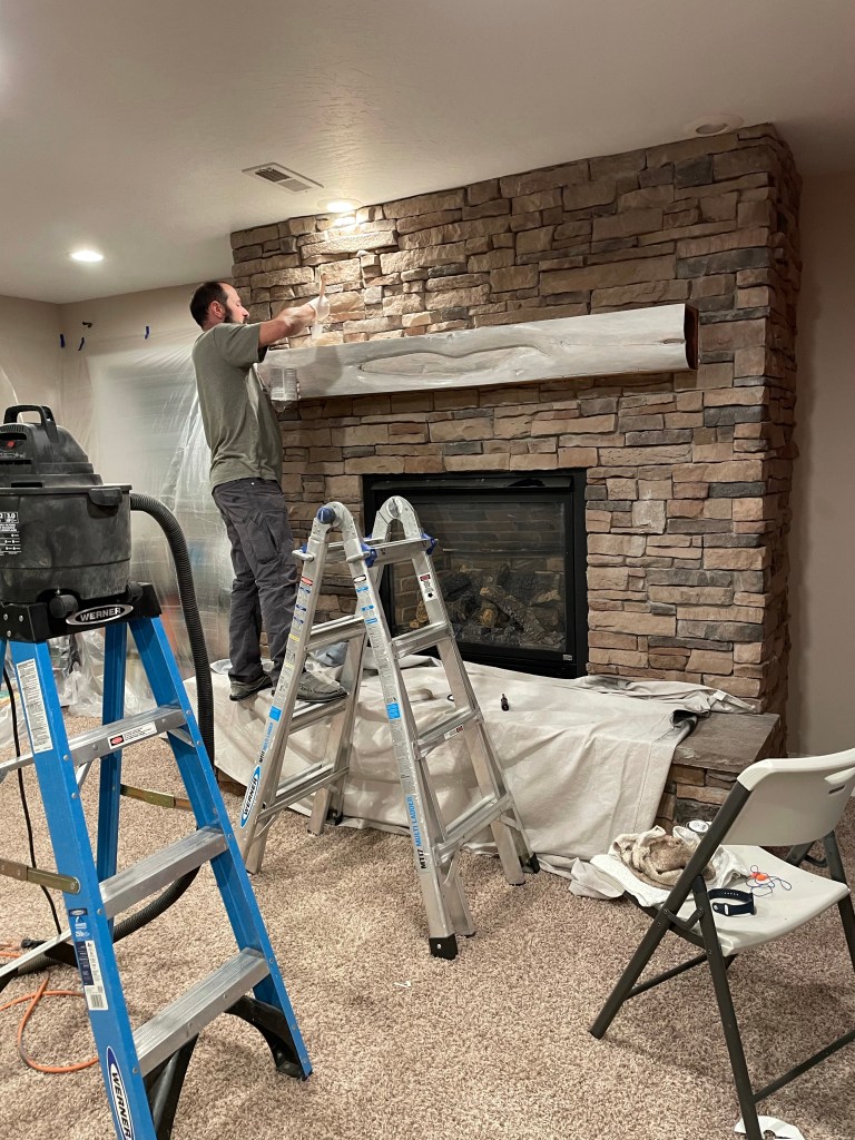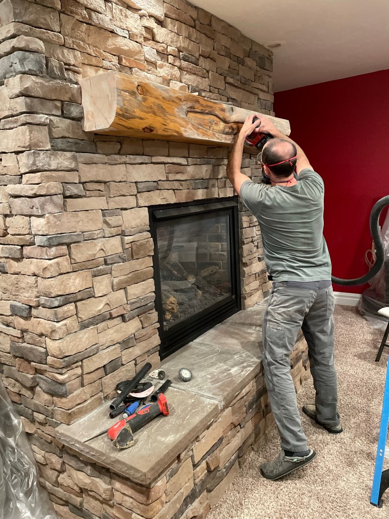 So, the basement flooded over Thanksgiving when the water softener malfunctioned and pumped approx. 150 gallons of water straight onto the floor in the middle of the night during its regen cycle. Since we were going to have to replace all the flooring anyway, we decided this was the time to sand and re-stain the mantel to be “not yellow”.