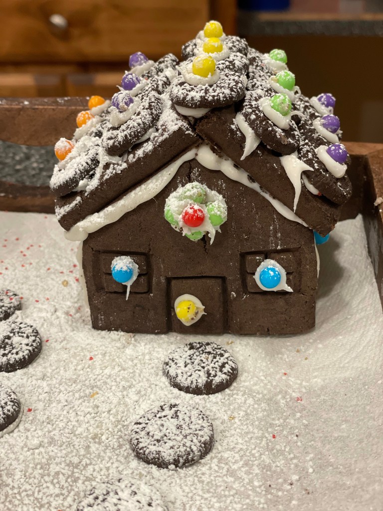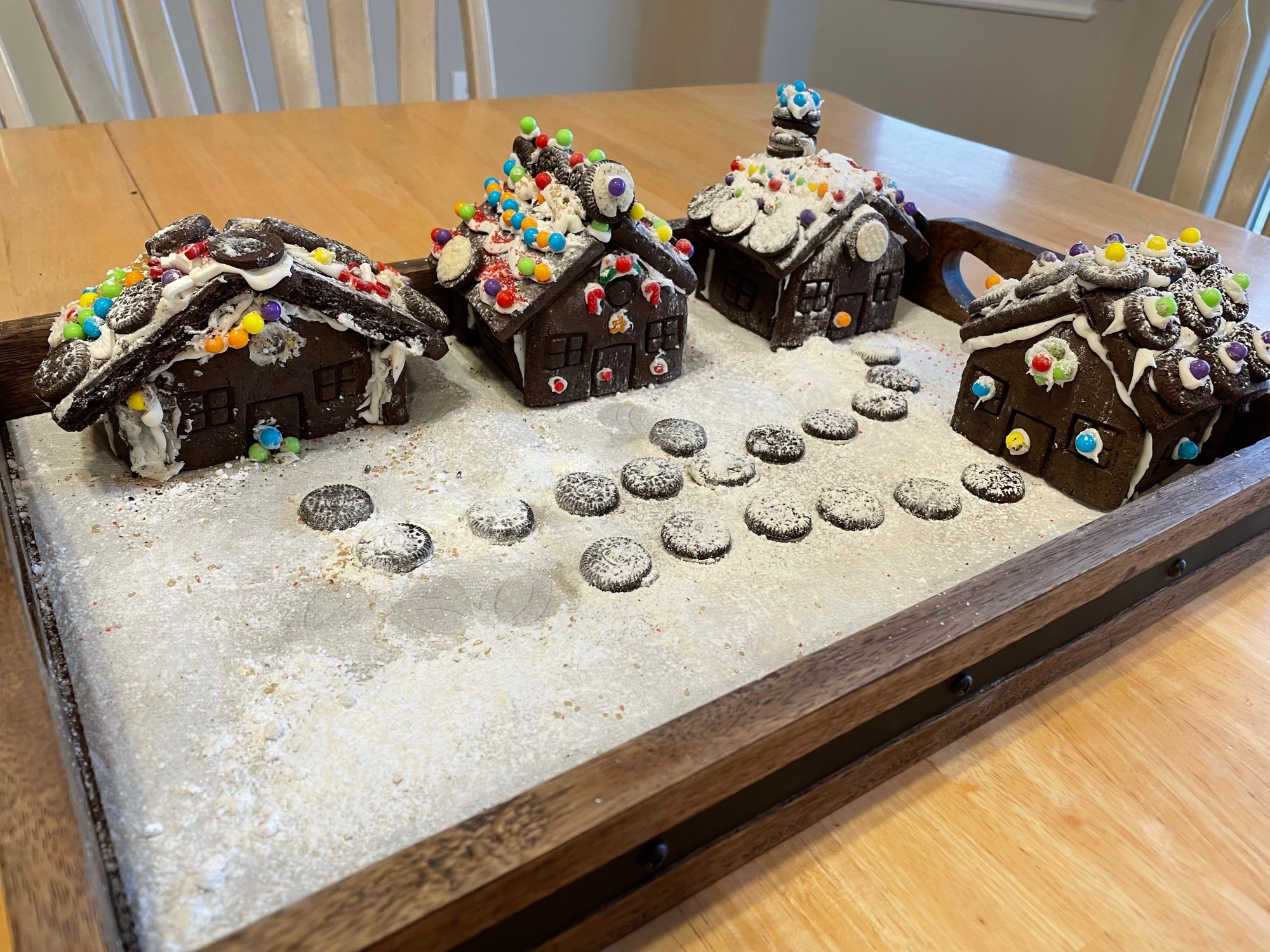 We found an Oreo cookie house kit and couldn’t resist a slight change from the traditional gingerbread kits. Here are the houses in our cookie subdivision.