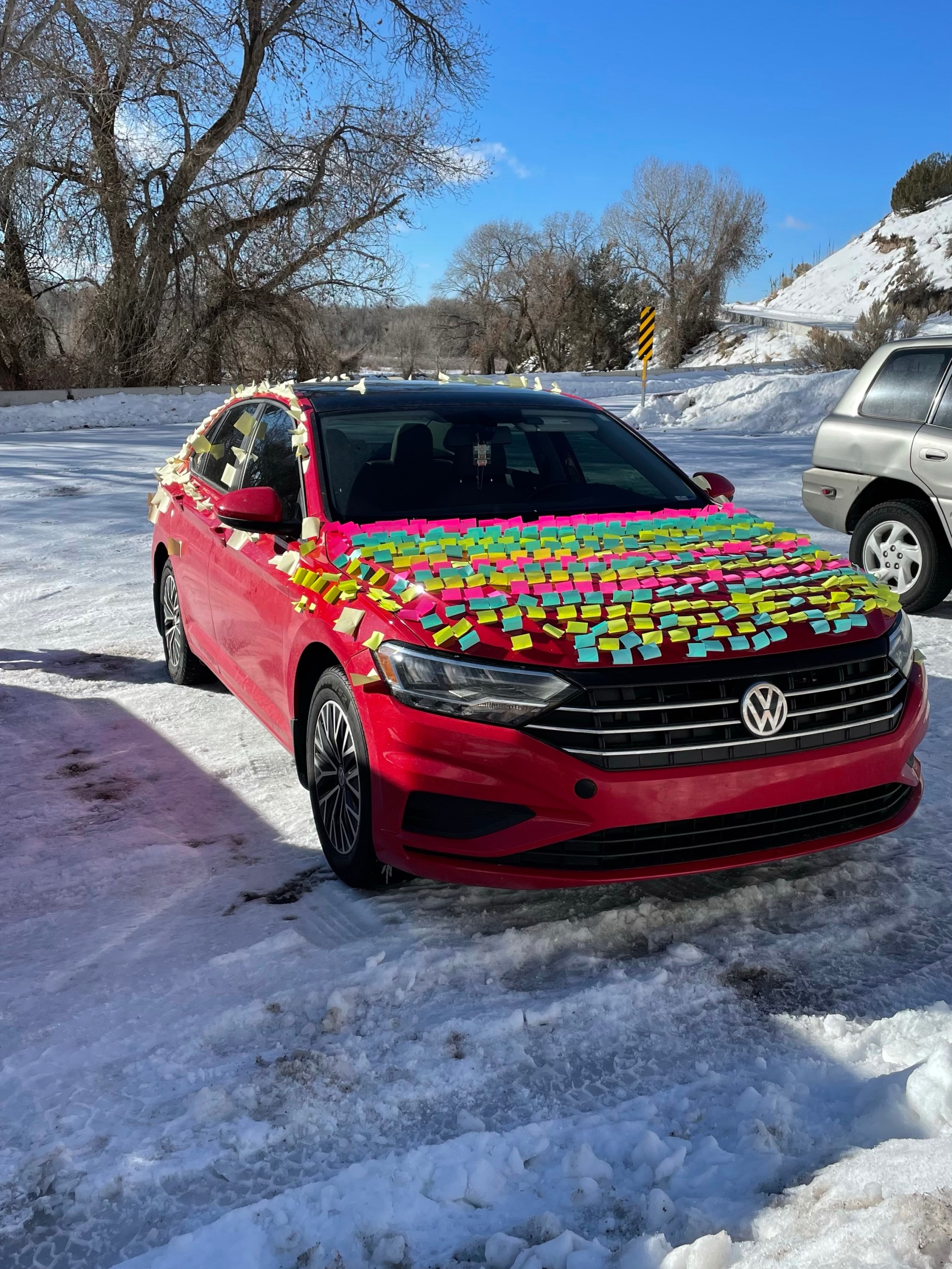some possible explanations: have too much post it notes at home…someone doesn’t like you…just felt like sprucing up the car…some kind of dare or challenge? nice photo!