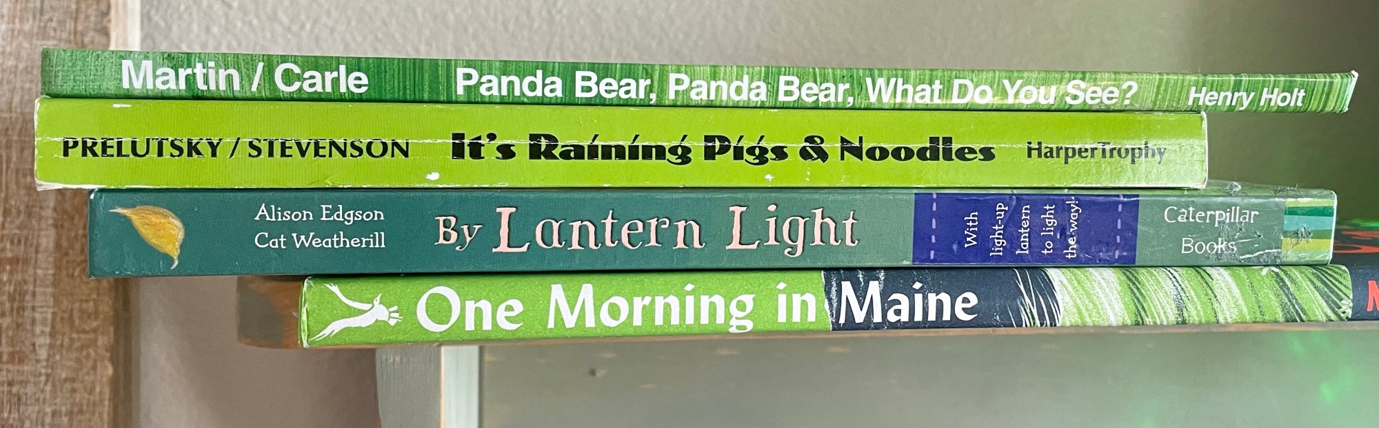 Book Spine Poetry – March March 3, 2022March 2, 2022 by heavenstobetty, posted in Holidays and Special Events, Homeschool, Photography Panda Bear, Panda Bear, What Do You See? It’s Raining Pigs and Noodles, By Lantern Light, One Morning in Maine. Share this: Email a link to a friend (Opens in new window) Email Print (Opens in new window) Print Share on X (Opens in new window) X Share on Facebook (Opens in new window) Facebook Share on Pinterest (Opens in new window) Pinterest Like Loading... Related