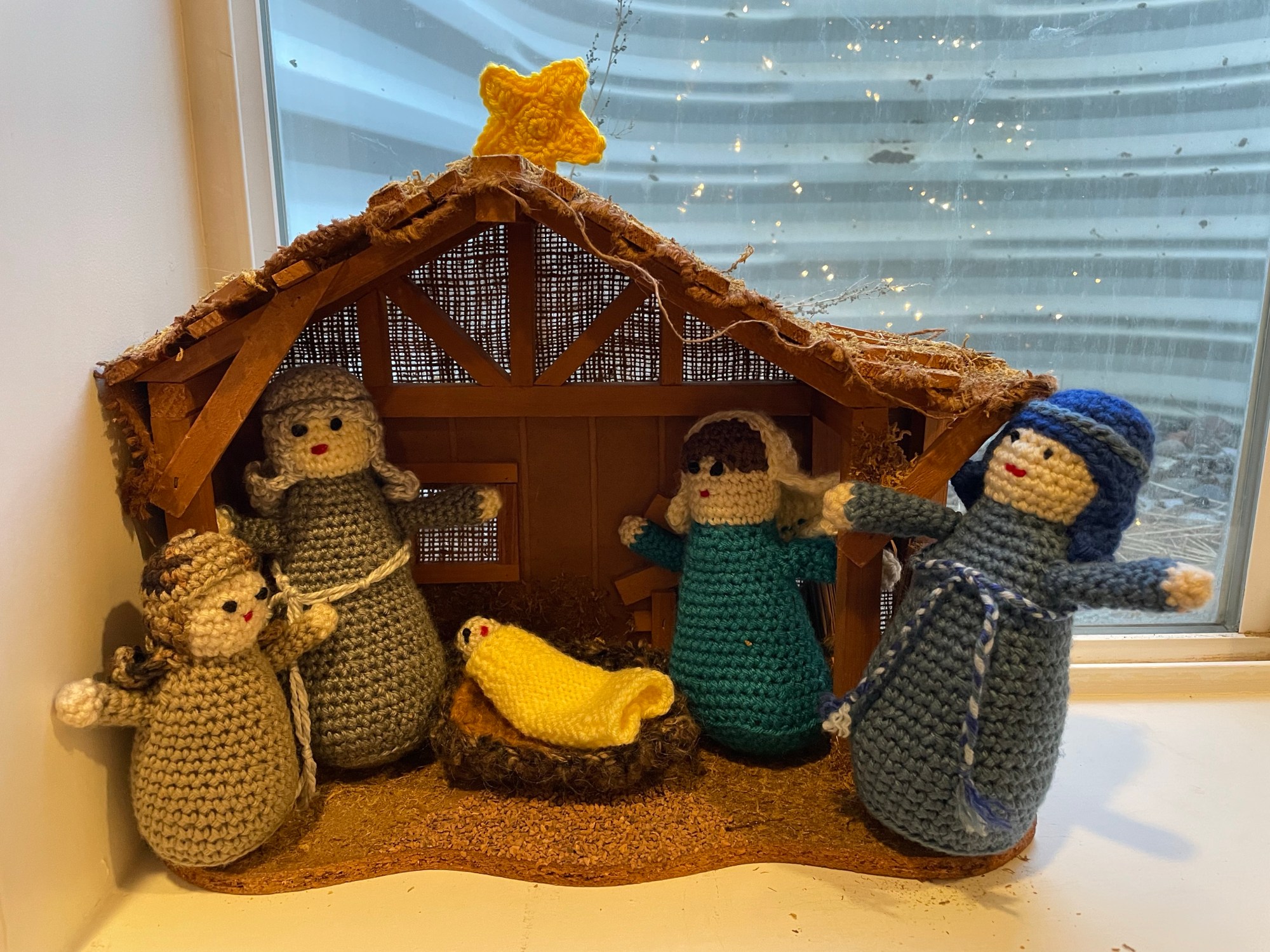 My mom made this nativity set. I think it’s crocheted. The kiddos and I found the stable at a thrift store this past year (2022) for a couple dollars.