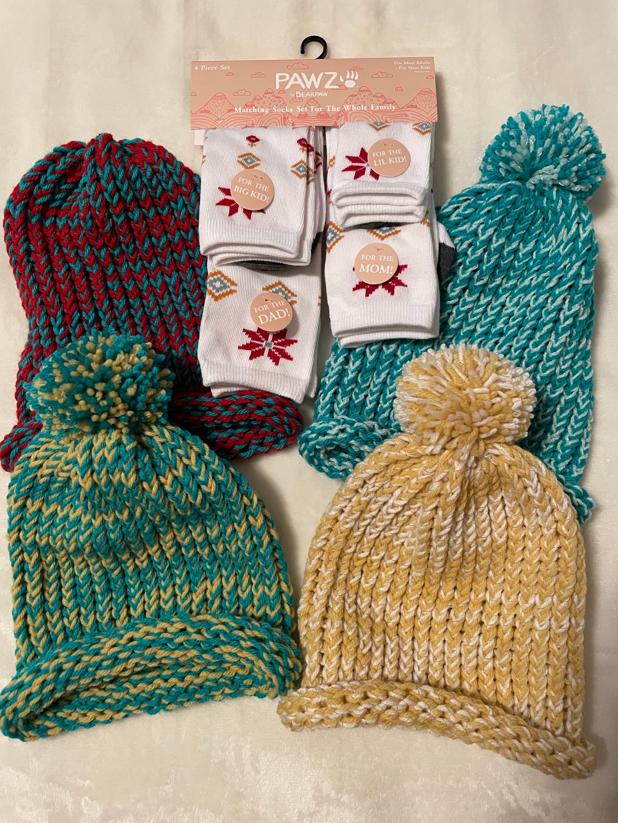 My daughter (age 10) and I found some cute family matching socks at TJ Maxx. We bought them for our friends and then I made them coordinating hats on our circle knitting loom.