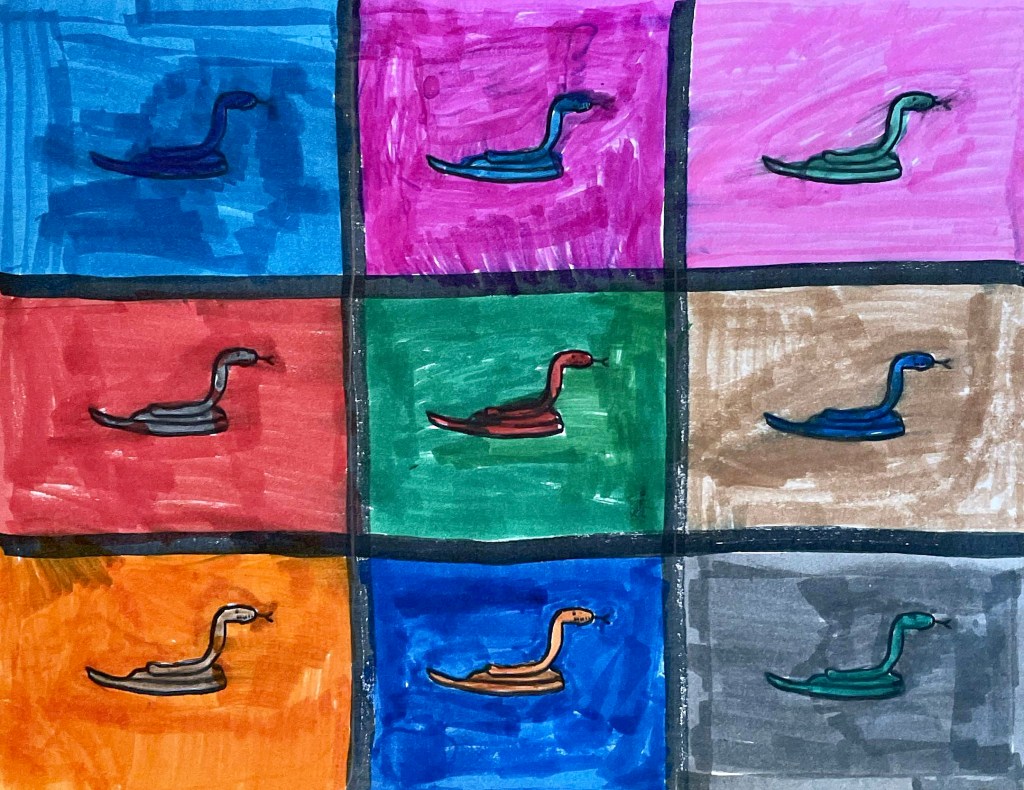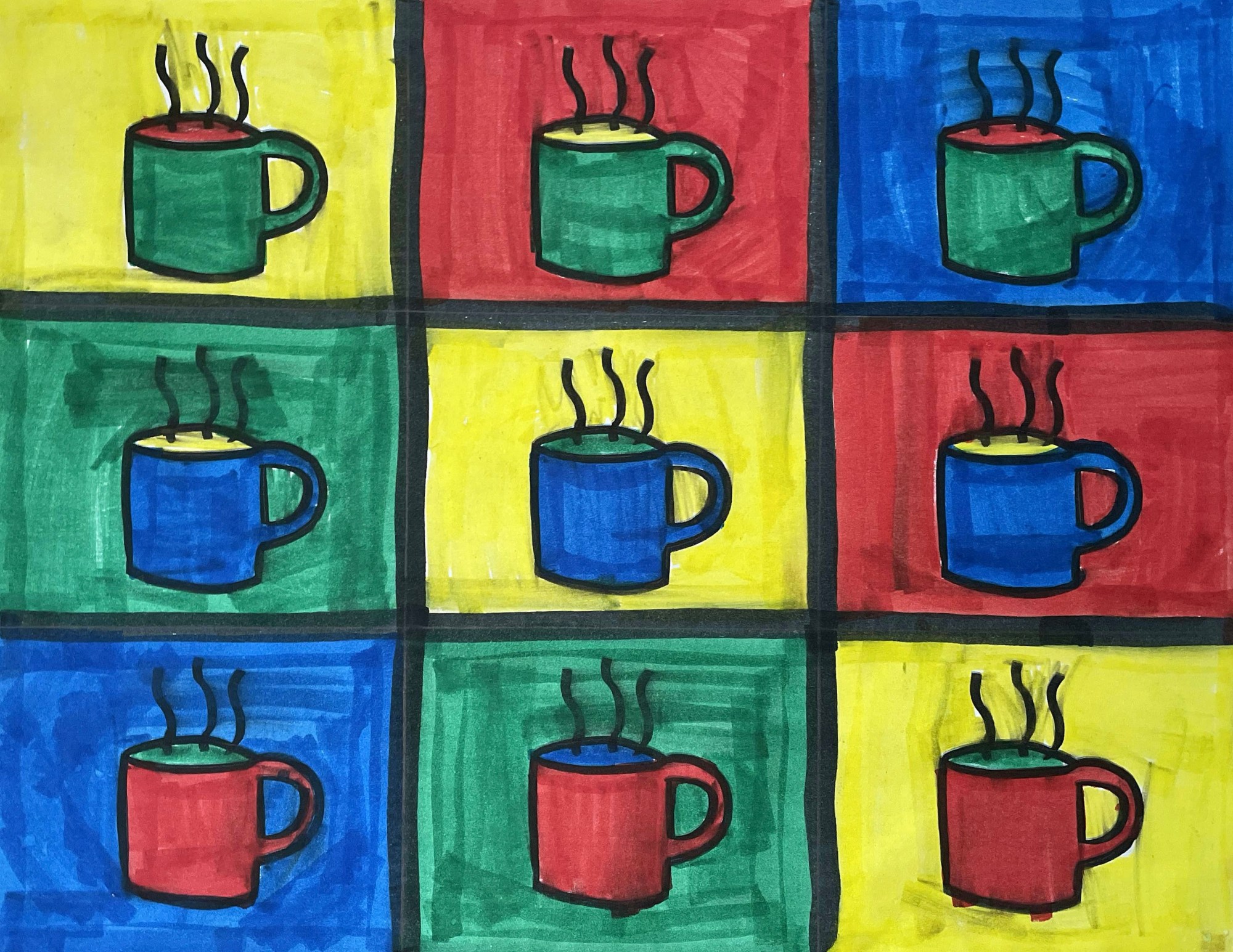 Next, I scanned the drawings and printed 9 images per one page of regular printer paper. Finally, the kiddos colored their pieces in Warhol style using markers.