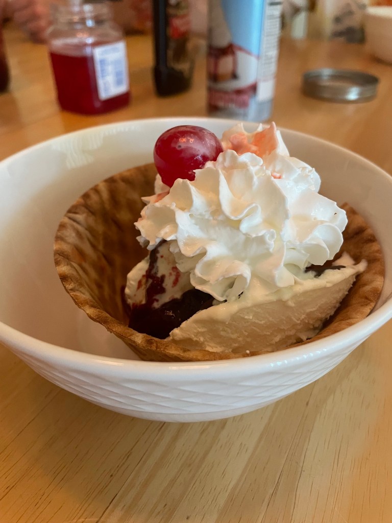homemade sundaes in waffle bowls: Tillamook vanilla ice cream, chocolate sauce, fresh homemade cherry compote, whipped cream and a cherry on top