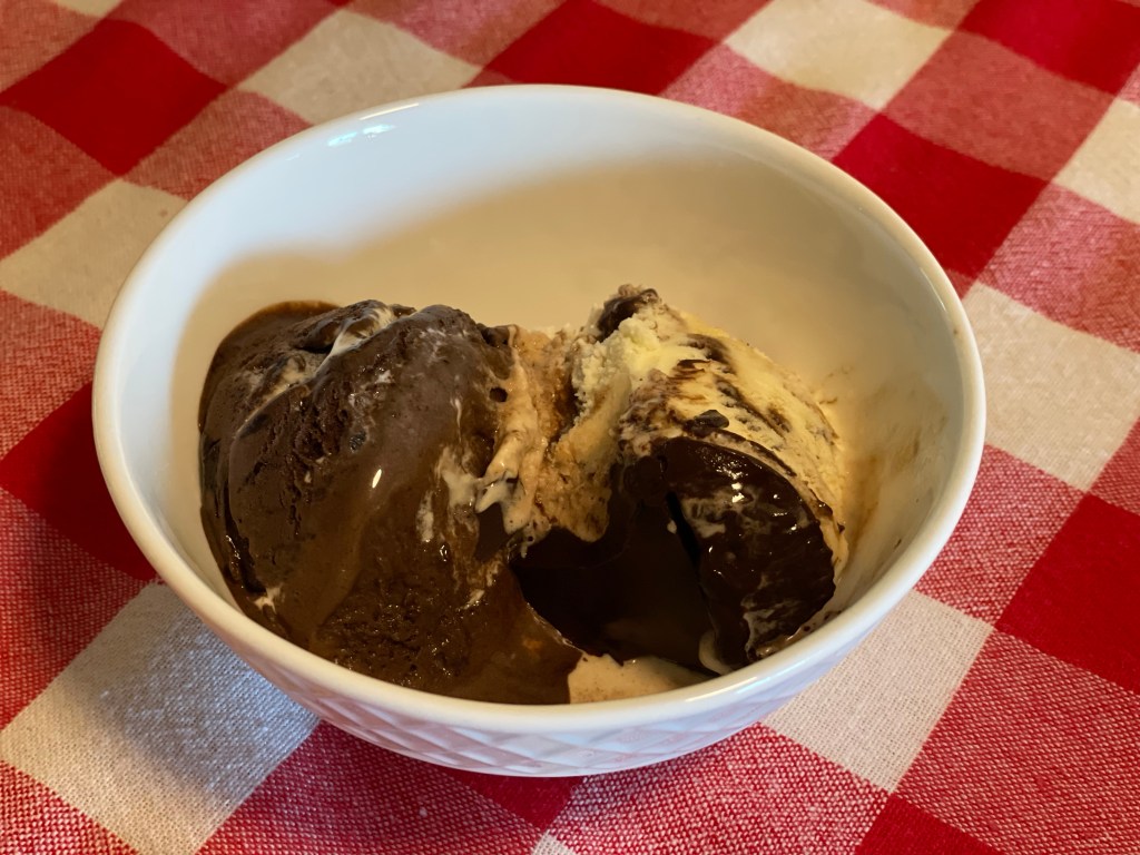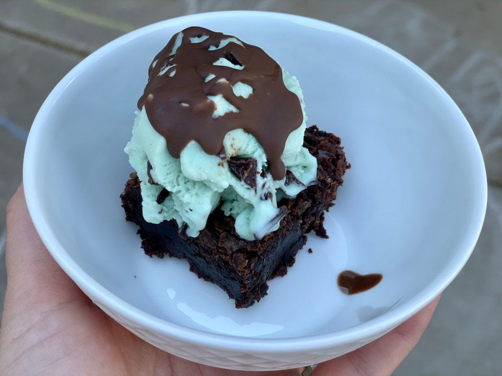 Chocolate brownie à la mode with Talenti Gelato Mediterranean Mint and hard shell chocolate topping