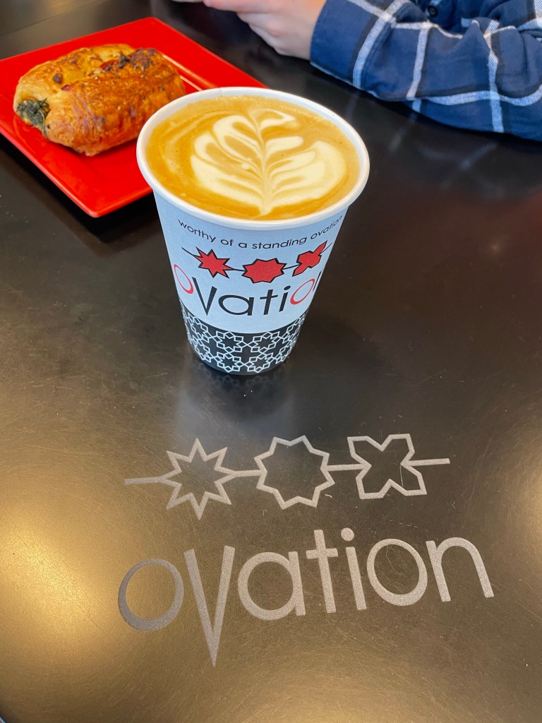 E got Moroccan spiced coffee and a Moroccan breakfast biscuit, I got a pistachio latte, 2 of the kiddos got hot chocolate, and we shared a toasted coconut scone and a spinach and feta croissant. Everything was super delicious. I’d have a pistachio latte from Ovation every day if I could!
