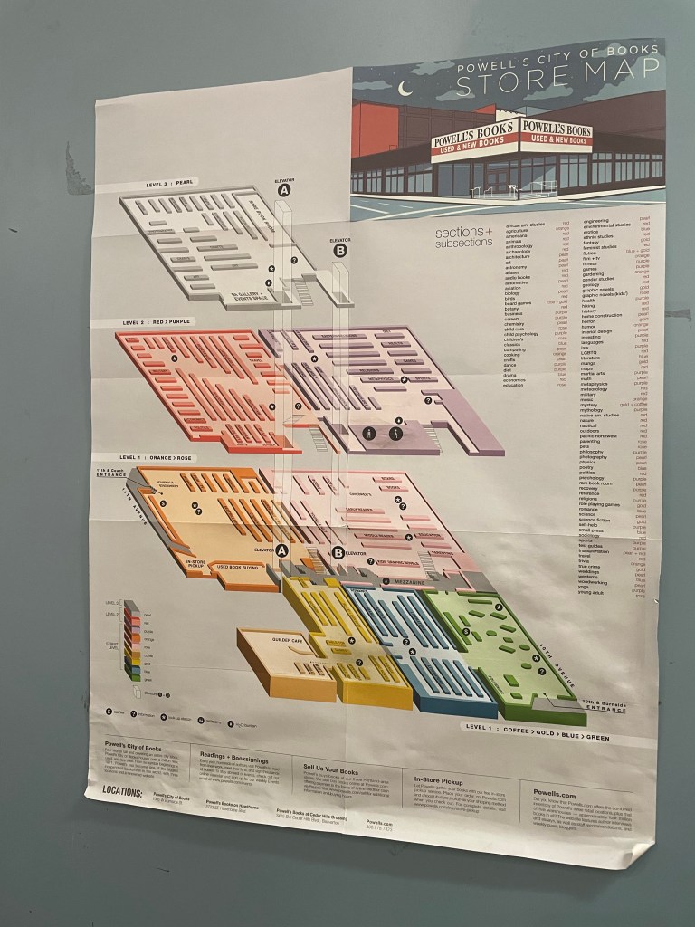“Powell’s City of Books is the largest used and new bookstore in the world, occupying an entire city block and housing approximately one million books. There are ten rooms: Green, Blue, Orange, Rose, Purple, Red, Gold, Pearl, Coffee, and the Rare Book Room. The public has access to the inventory housed in the nine rooms of the store, including literature, children’s and young adult, science fiction and fantasy, mystery, romance, graphic novels, history, politics, religion, heath and wellness, philosophy, fine arts, crafts, science, entertainment, cooking, gardening, new arrivals, bestsellers, used books, small press, and gift items.” – from the website